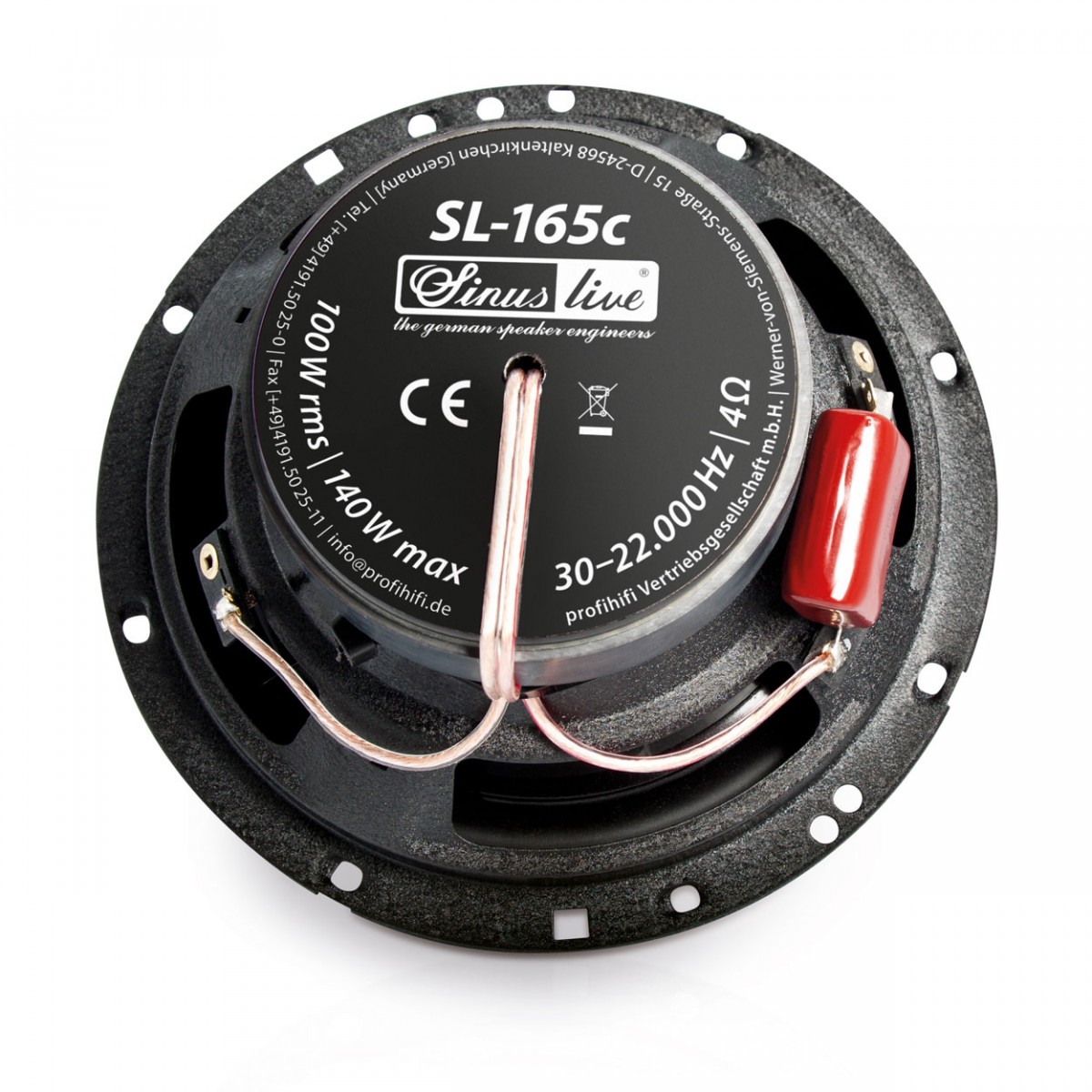 Sinus Live SL-165C sú kvalitné koaxiálne reproduktory s polypropylénovou membránou s uhlíkovými vláknami a gumovým závesom - skvelá odolnosť proti vlhkosti. Po zvukovej stránke patria k nadpriemerným reproduktorom v podobnej cenovej kategórii. Tento systém je navrhnutý pre všetkých, ktorí požadujú vysokú zaťažiteľnosť a súčasne bezproblémovú montáž. Výhybky sú optimalizované pre 6 dB techniku. Modely SL sú navyše opatrené ochranou výškového reproduktora PTC. Oceľový kôš spolu so sklolaminátovým nosičom kmitacej cievky zaisťujú vysokú zaťažiteľnosť.