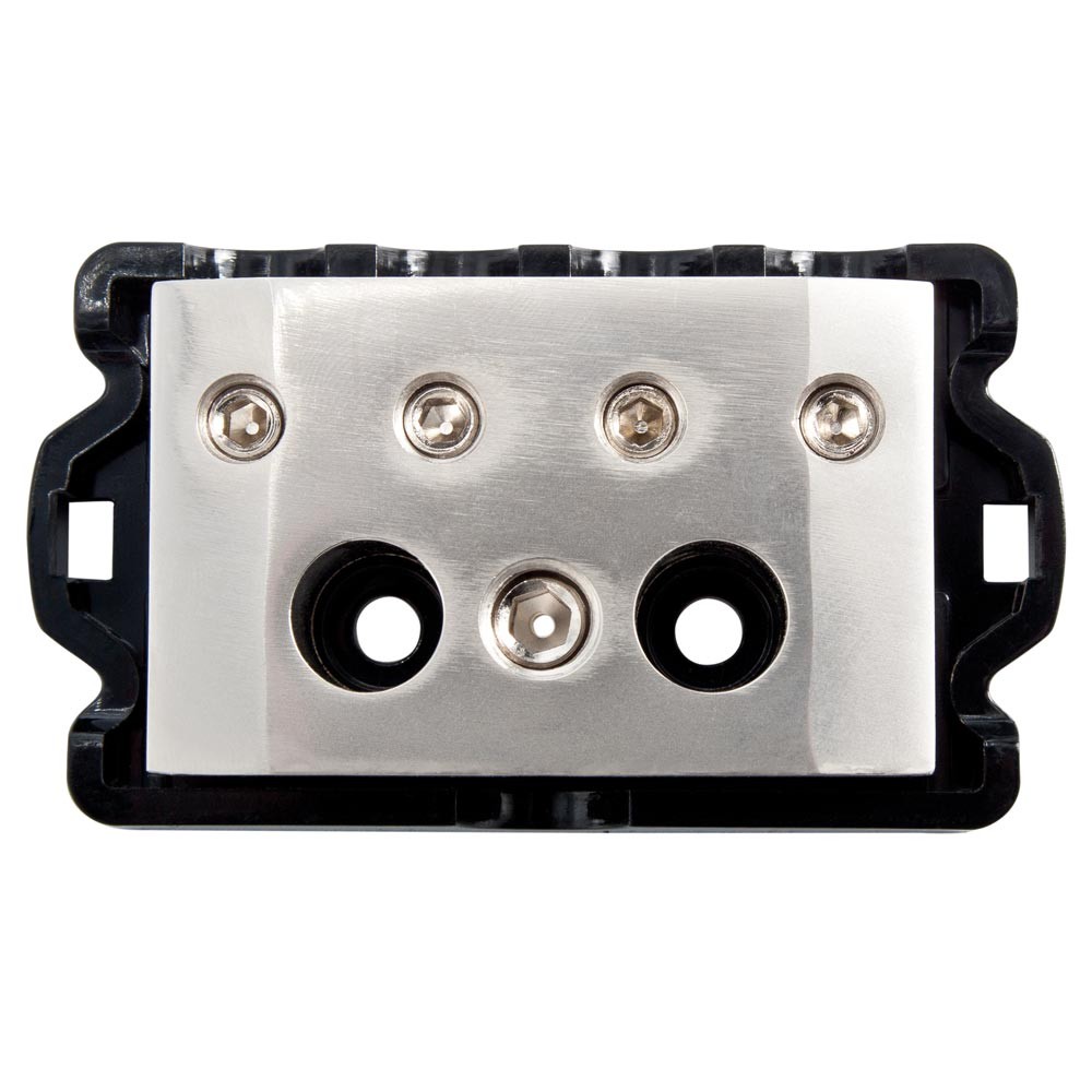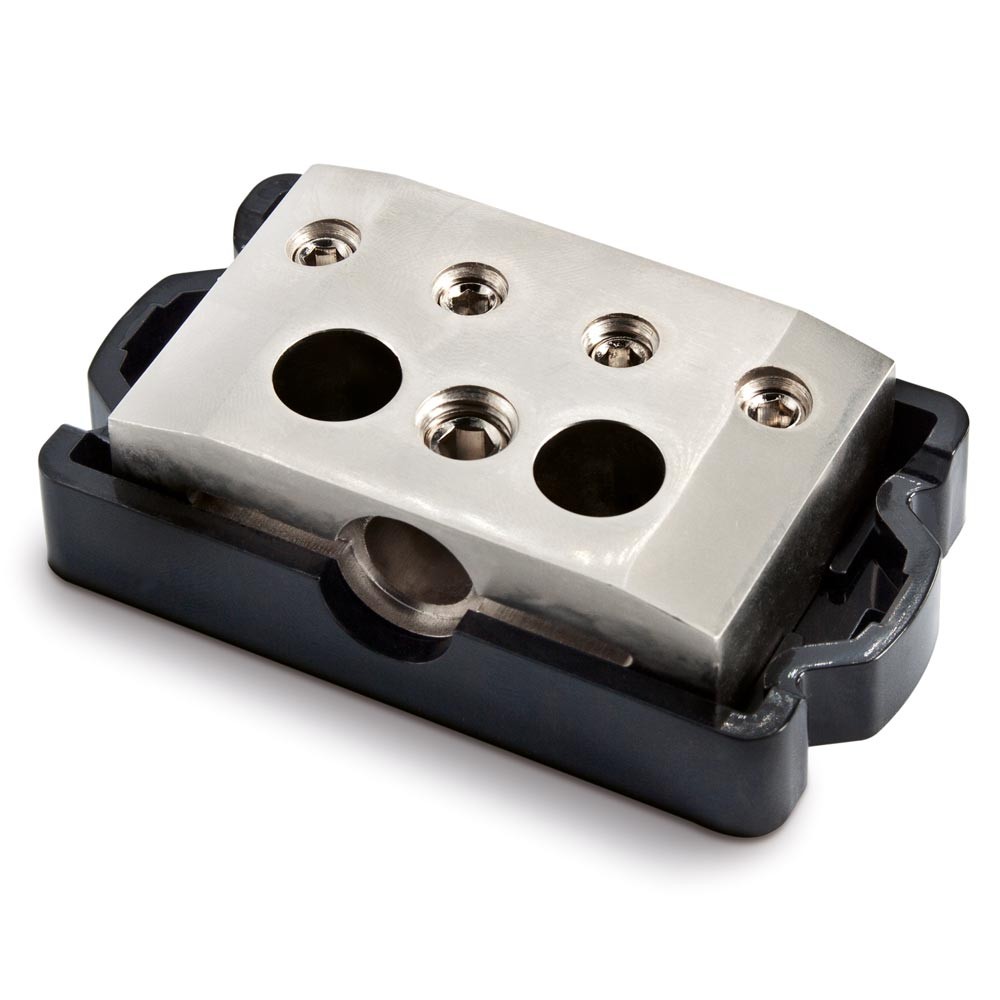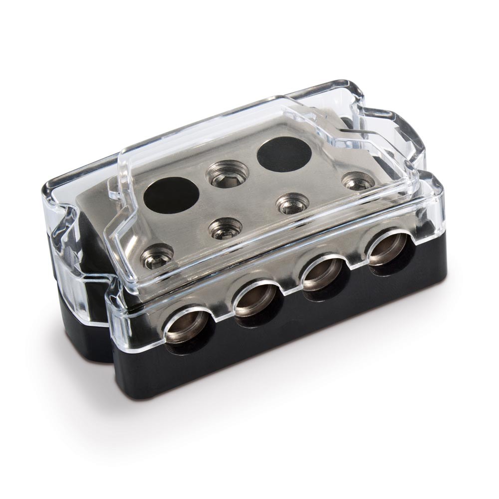 Distribučný blok s jedným vstupom a štyrmi výstupmi. Masívny distribučný blok na rozdelenie napájacích káblov s pevným plastovým krytom. V plaste sú dva otvory na pevné uchytenie.