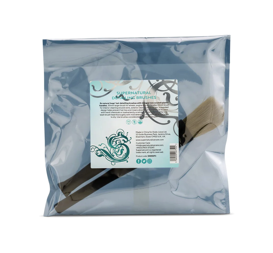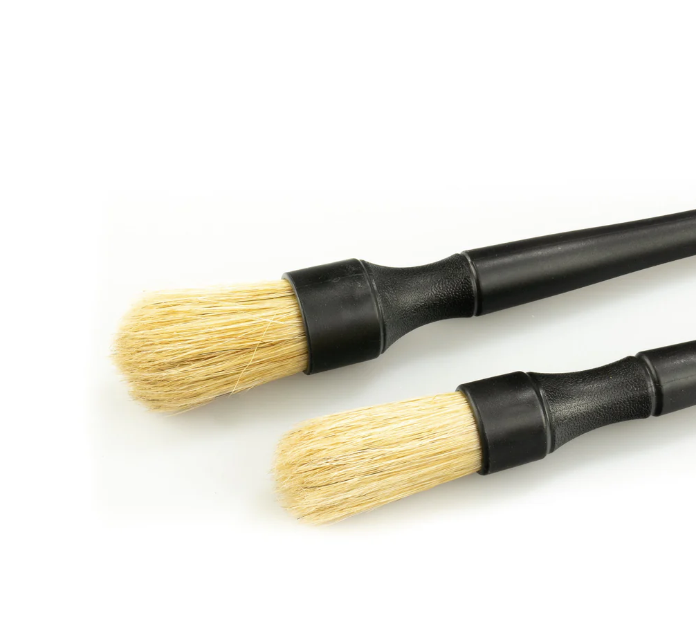 Štetce Supernatural sú skvelé na prácu s detailmi, pretože majú mäkšie, prírodné štetiny a v porovnaní s alternatívami zo syntetického nylonu, sú napriek tomu dostatočne tuhé, aby povrchy čistili dôkladne, efektívne a rýchlo. Všeobecne môžete tieto štetce použiť na kolesá, plastové mriežky a motorový priestor, ale môžete sa rozhodnúť ich použiť aj na čistenie ventilačných otvorov a spojov obloženia v interiéri auta. Rukoväte štetce sú vyrobené z jedného kusu plastovej konštrukcie. Tým sa nielen zabráni strate štetín, ale štetce vydržia oveľa dlhšie, pretože objímka nemôže prasknúť. A pretože nemá žiadny krúžok, nemôže poškriabať jemné povrchy ani sa zaseknúť za lúče kolesa. Sada obsahuje dva štetce. Menší štetec s priemerom 25 mm je skvelý na použitie v interiéri (rohy palubnej dosky, vetracie otvory, obloženie, spínače atď.) alebo pre náročnejšie vonkajšie práce (znaky, alu kolesá). Potom je tu väčší štetec s priemerom 30 mm, čo je ideálna veľkosť pre všeobecné čistenie kolies, väčšie vonkajšie vetracie otvory a mriežky, detaily motorového priestoru, čistenie palivovej nádrže atď.