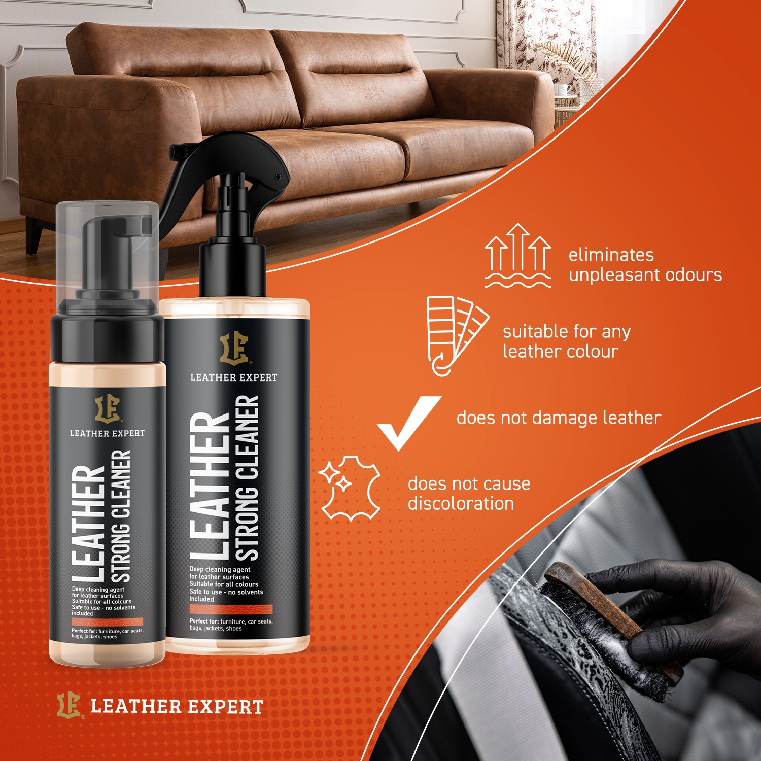Tento skvelý výrobok účinne odstraňuje všetky druhy škvŕn a nečistôt z povrchu kože, odstraňuje nepríjemné zápachy (napr. cigaretový dym, ľudský pot). Nepoškodzuje kožu. Je určený na intenzívne používanú kožu. Leather Expert Strong Cleaner sa používa na čistenie rôznych druhov hladkej kože v automobiloch, na koženom nábytku, galantérii a kabelkách. Vďaka špeciálnej penivej látke vytvára Strong Cleaner bohatú a stabilnú penu, ktorá prispieva k vynikajúcim výsledkom čistenia. Výrobok je bezpečný pre životné prostredie, ekologický, biologicky odbúrateľný a nie je testovaný na zvieratách. Leather Expert Strong Cleaner má silné čistiace vlastnosti. Nepoužívajte na semiš a nubuk!Hlavné vlastnosti
