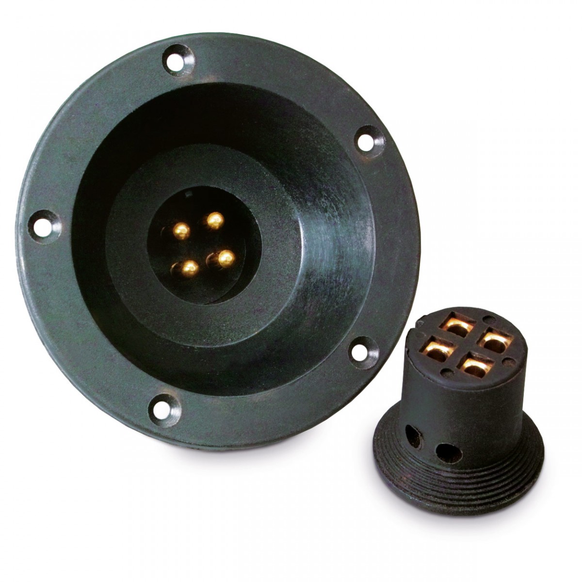 Polaritou chránený reproduktorový konektor + zapustená namontovaná zásuvka so štyrmi portami. Vhodné pre basové reproduktory s dvojitou kmitacou cievkou alebo bi-amp.