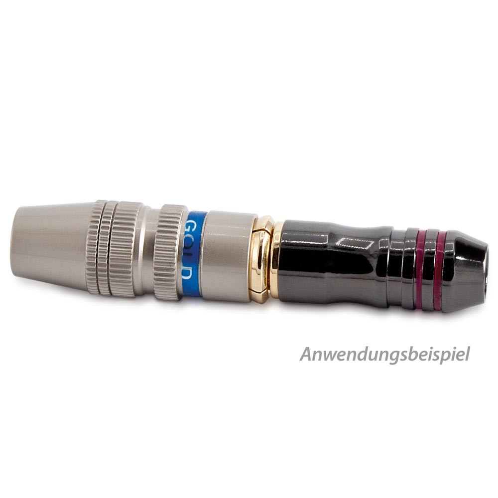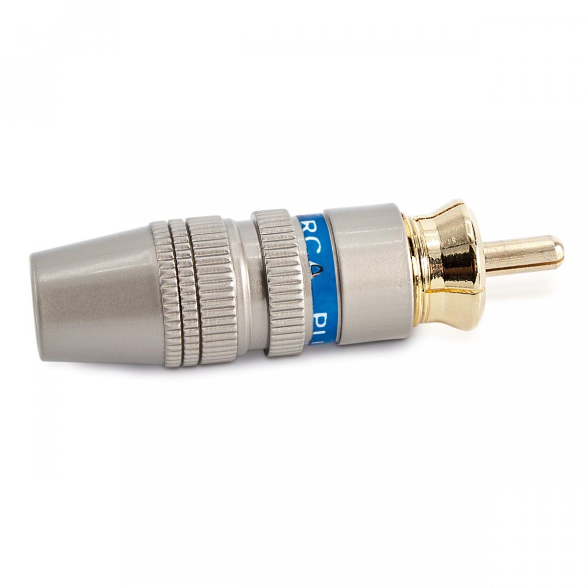 Dve high-end RCA zástrčky s funkciou shell na spájkovanie. Zástrčky sú vyrobené z medi H58 a z pozláteného materiálu. Drážkový stredový čap a štrbinový štít zaisťujú bezpečné a bezporuchové spojenie. Titánové farebné púzdra sú jednoducho odskrutkované kónickým tvarom pomocou frézovania zo stredného kolíka, cinch kábel tak môže byť ľahko spájaný. Plášť prezlieka štrbinový štít keď je naskrutkovaný, čím dodáva ďalšie istenie pre kolík. Na odlíšenie káblov sú konektory označené modrým a červeným krúžkom. Cena za 2 kusy.