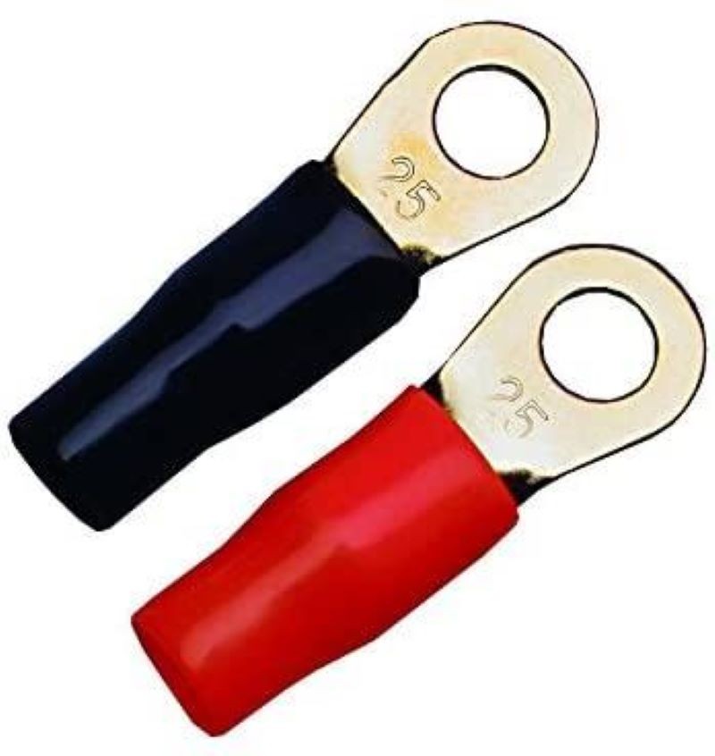 Pozlátené očká na kábel s prierezom 25 mm². Je možné spájkovať alebo stlačiť kliešťami. Balenie obsahuje 4 kusy očiek (2x červená a 2x čierna bužírka). Vnútorný priemer očka je 8,2 mm a vonkajší priemer potom 16 mm.