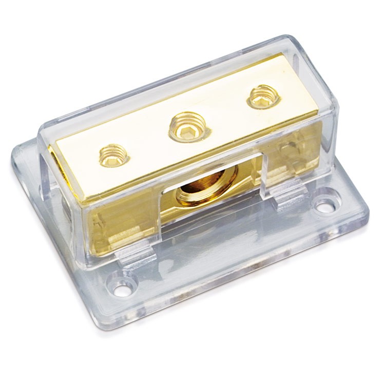 Rozdeľovací blok s pozlátenými kontaktnými plochami na rozdelenie napájacích káblov.