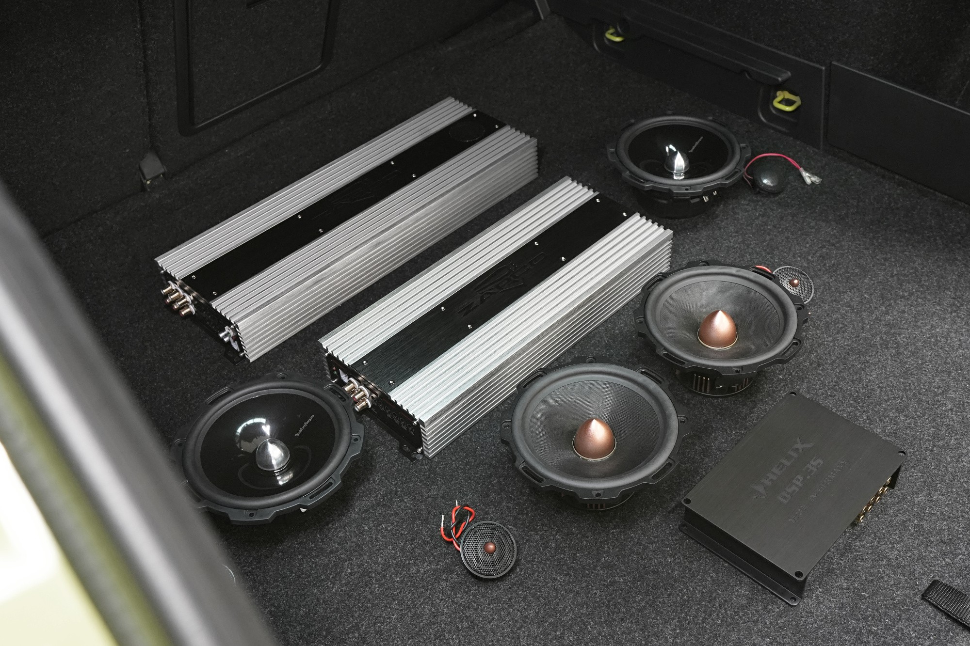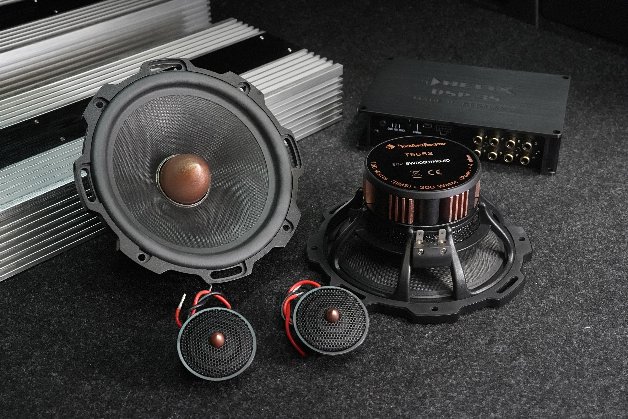 Poďme sa najprv zoznámiť s produktmi použitými v tejto zaujímavej inštalácii. Základom každého ozvučenia sú reproduktory, tentoraz od amerického výrobcu Rockford Fosgate. A to rovno z najvyššieho modelového radu T5! Tie logicky budeme inštalovať do predných dverí a doplníme ich komponentmi toho istého výrobcu v zadných dverách. O výkon aj kvalitný zvuk sa postará dvojica zosilňovačov taktiež amerického výrobcu Zapco a DSP procesor Helix.