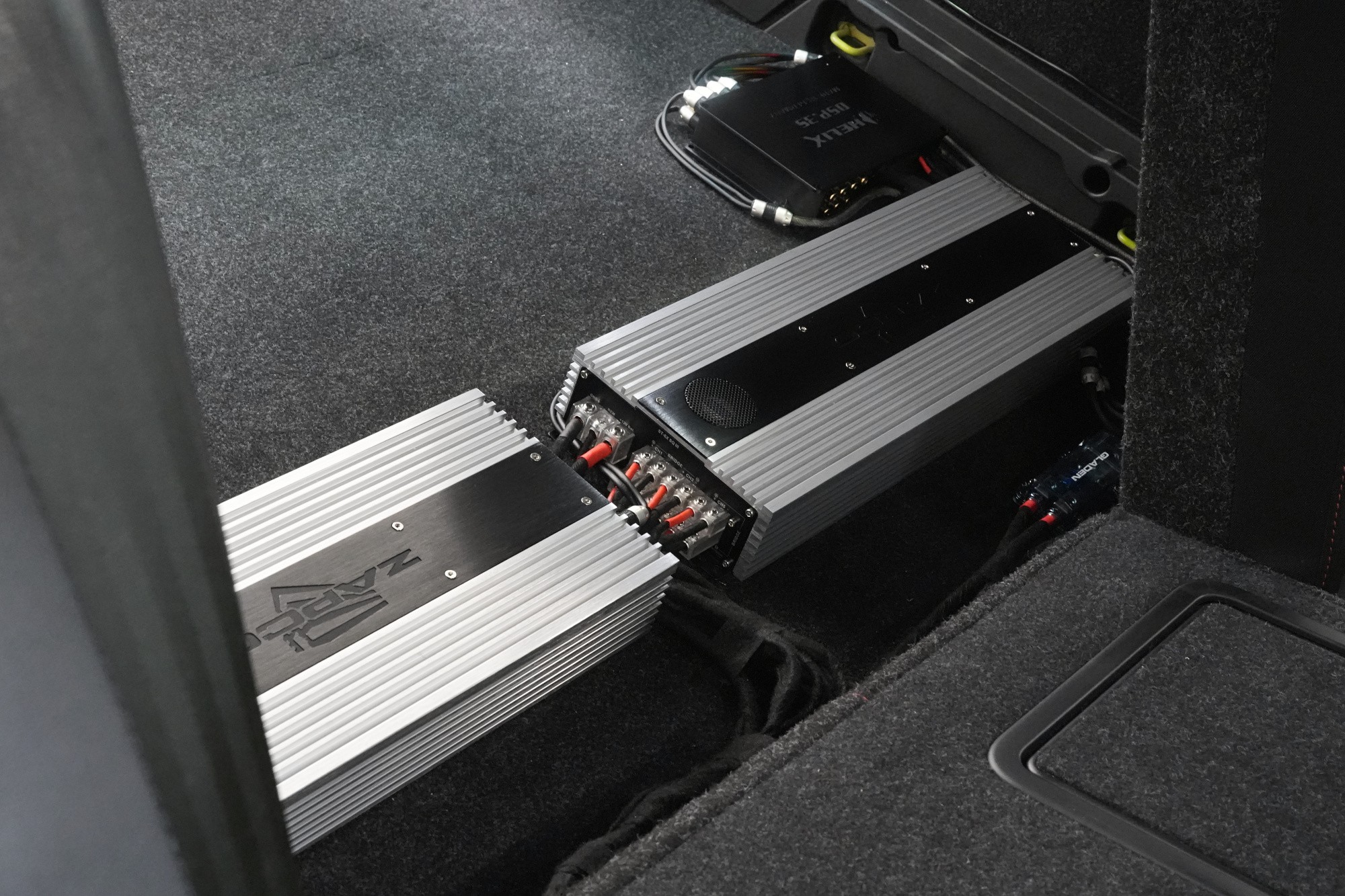 Žiadna kvalitná inštalácia sa nezaobíde bez zosilňovačov a v tomto prípade aj adekvátne výkonných. Pre napájanie všetkých reproduktorov sme zvolili 6kanálový zosilňovač Zapco analógovej triedy AB, ktorý poskytuje reproduktorom nielen dostatočný výkon, ale aj dôležitú kvalitu zvuku. Zosilňovač sme doplnili digitálnym monoblokom toho istého výrobcu a modelového radu. Všetko doplnené DSP procesorom, vďaka ktorému neskôr naladíme zvuk.