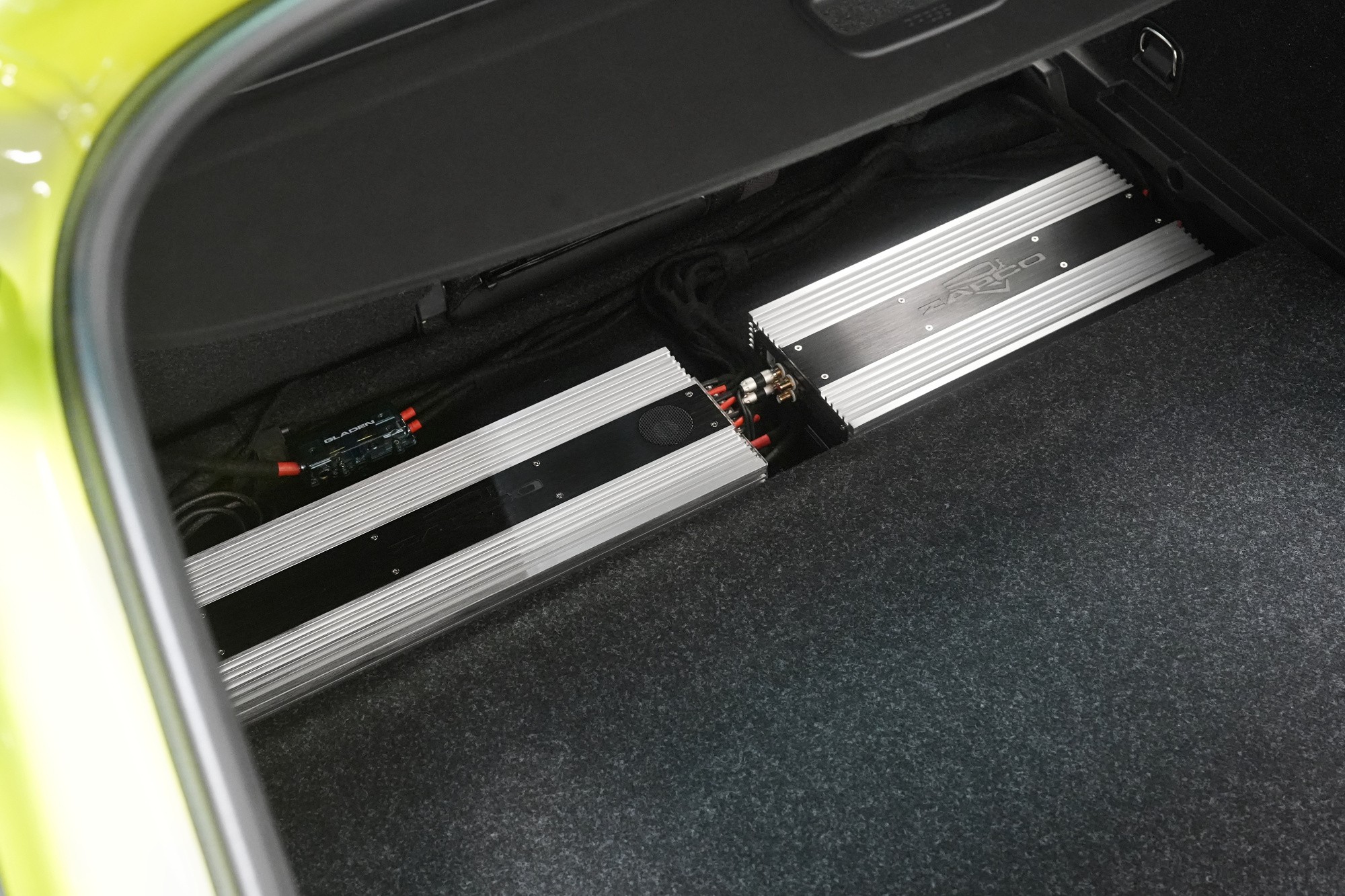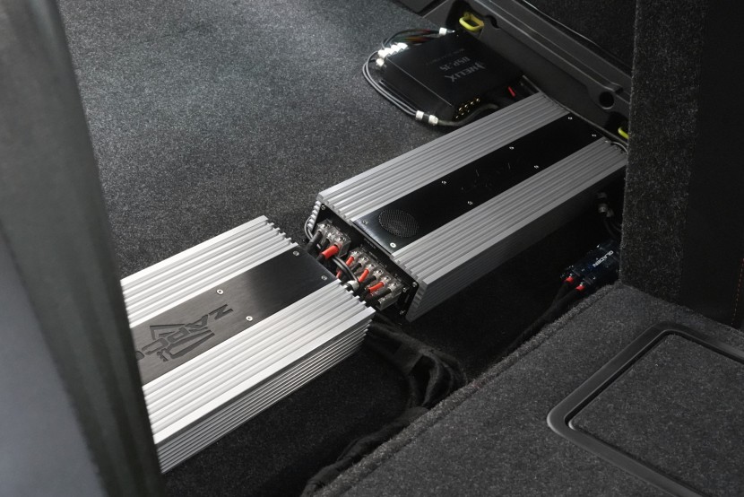 Oba zosilňovače aj DSP procesor sme inštalovali do dvojitého dna batožinového priestoru, kde budú vo finále dokonale ukryté. Vďaka integrovaným vetrákom nehrozí zosilňovačom prehrievanie ani pri enormných výkonoch.