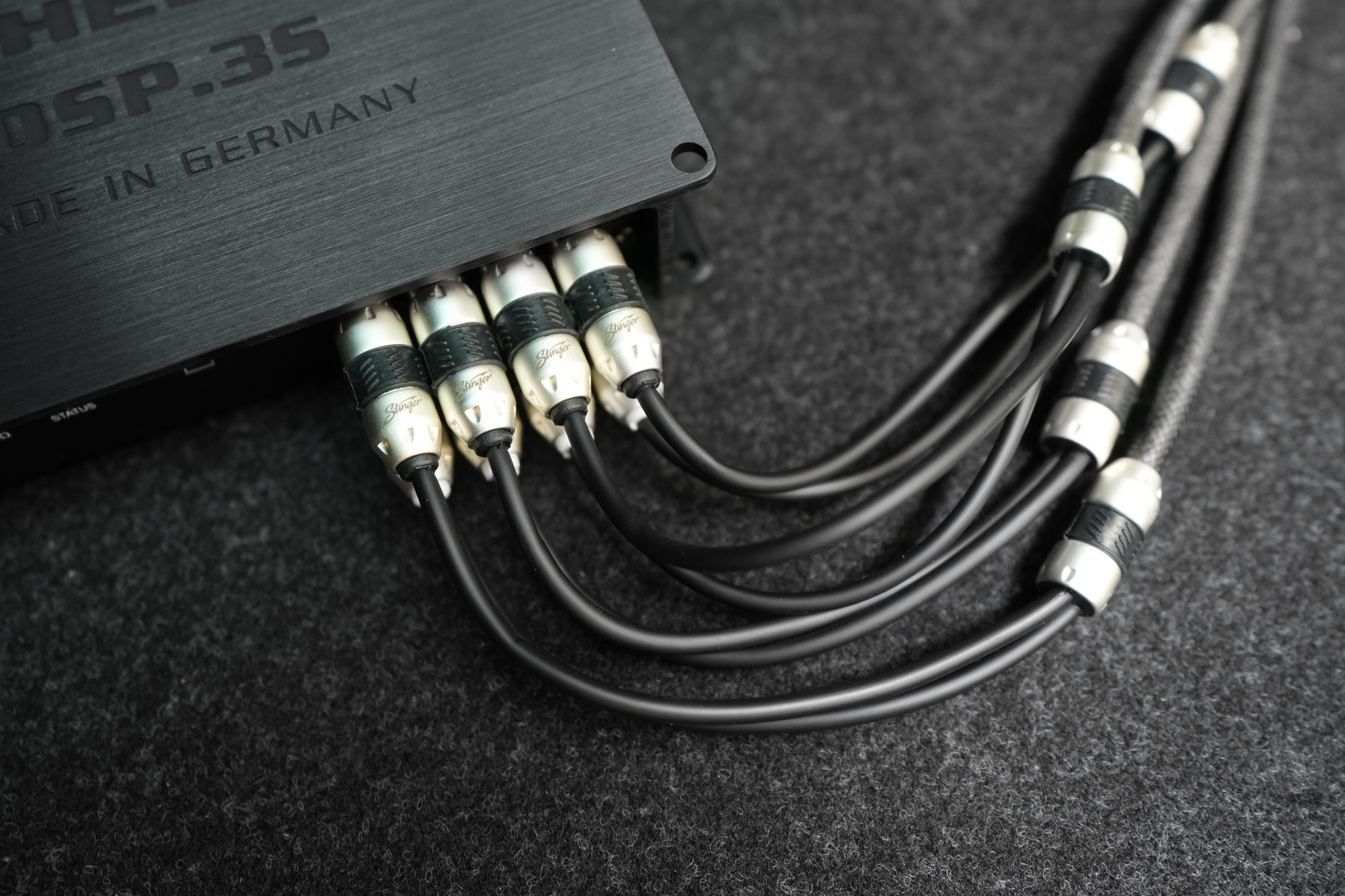 DSP procesor. Zariadenie, bez ktorého sa žiadny kvalitný audio systém v dnešnej dobe nezaobíde. Vďaka nemu budeme schopní zvuk v tomto automobile detailne naladiť, aby poskytoval majiteľovi vozidla požadovaný výsledok. Na účely tejto inštalácie sme zvolili DSP procesor Helix od nemeckých majstrov z Audiotec-Fischer. Kvalitné komponenty si žiadajú aj kvalitné signálové káble. V tomto prípade padla voľba na druhý najvyšší rad 8000 amerického výrobcu Stinger, ktoré zaistí ničím nerušený prenos zvuku.