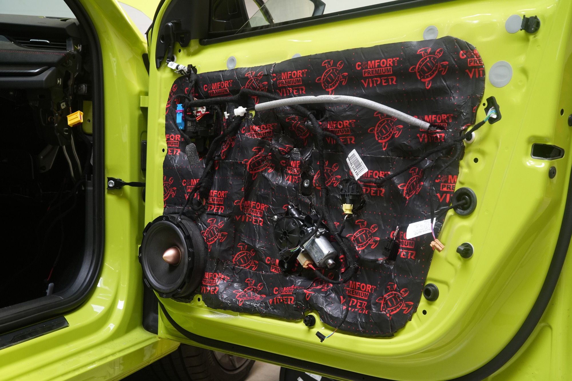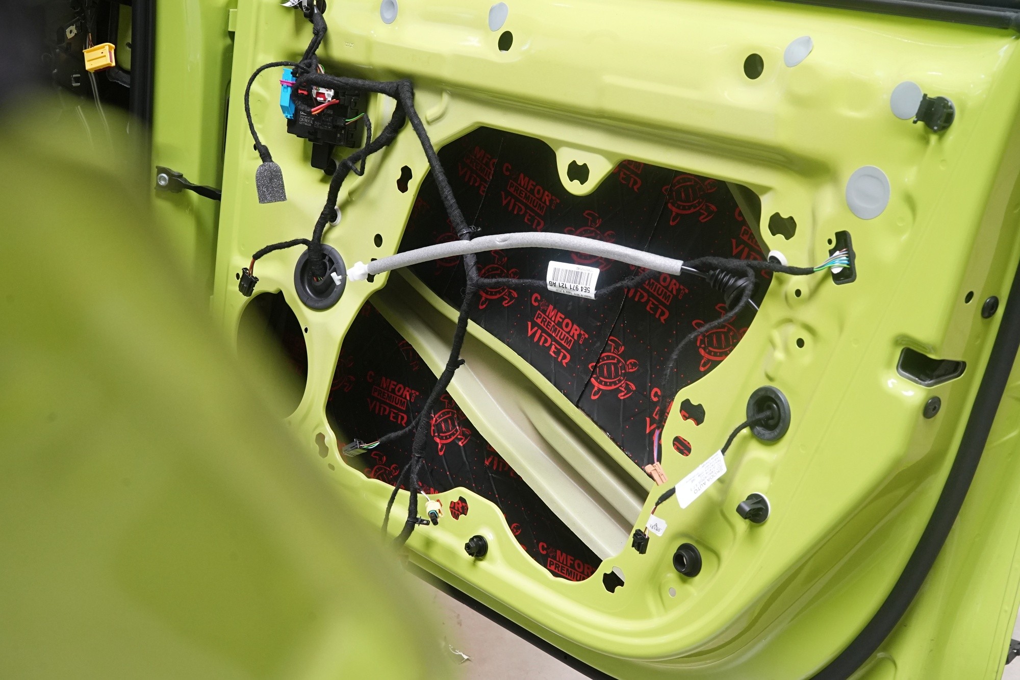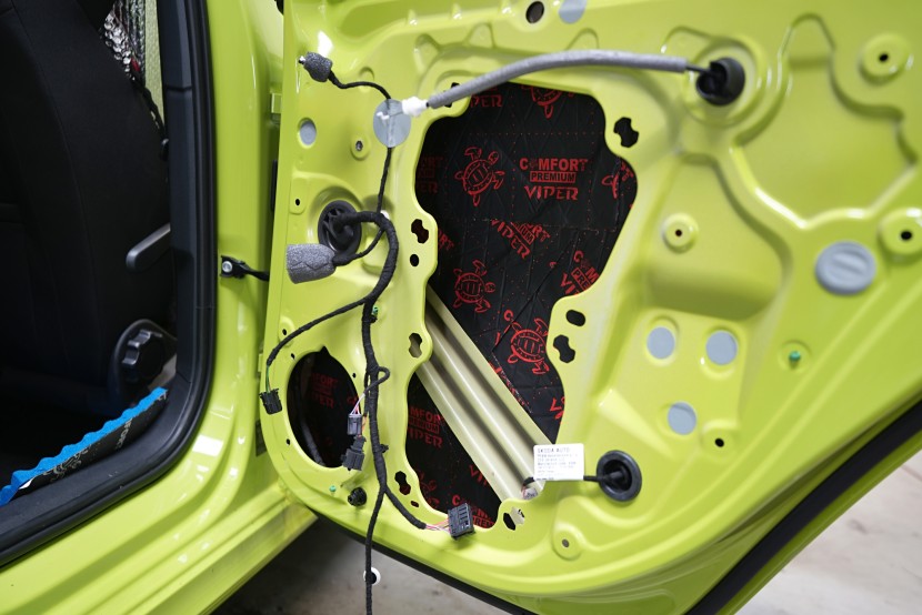 Plastové výplne dverí opatrujeme poslednými dvoma vrstvami, konkrétne opäť antivibračným materiálom Comfortmat Cobra a finálne materiálom pohlcujúcim hluk Comfortmat Soft Wave Expert. Táto flexibilná pena s tvarovou pamäťou sa lepí na plastové čalúnenie dverí z dôvodu zamedzenia škrípania a vŕzgania nielen plastov, ale aj drôtov a ďalších komponentov vo vnútri dverí a dodatočne aj zníži hluk tejto oblasti.