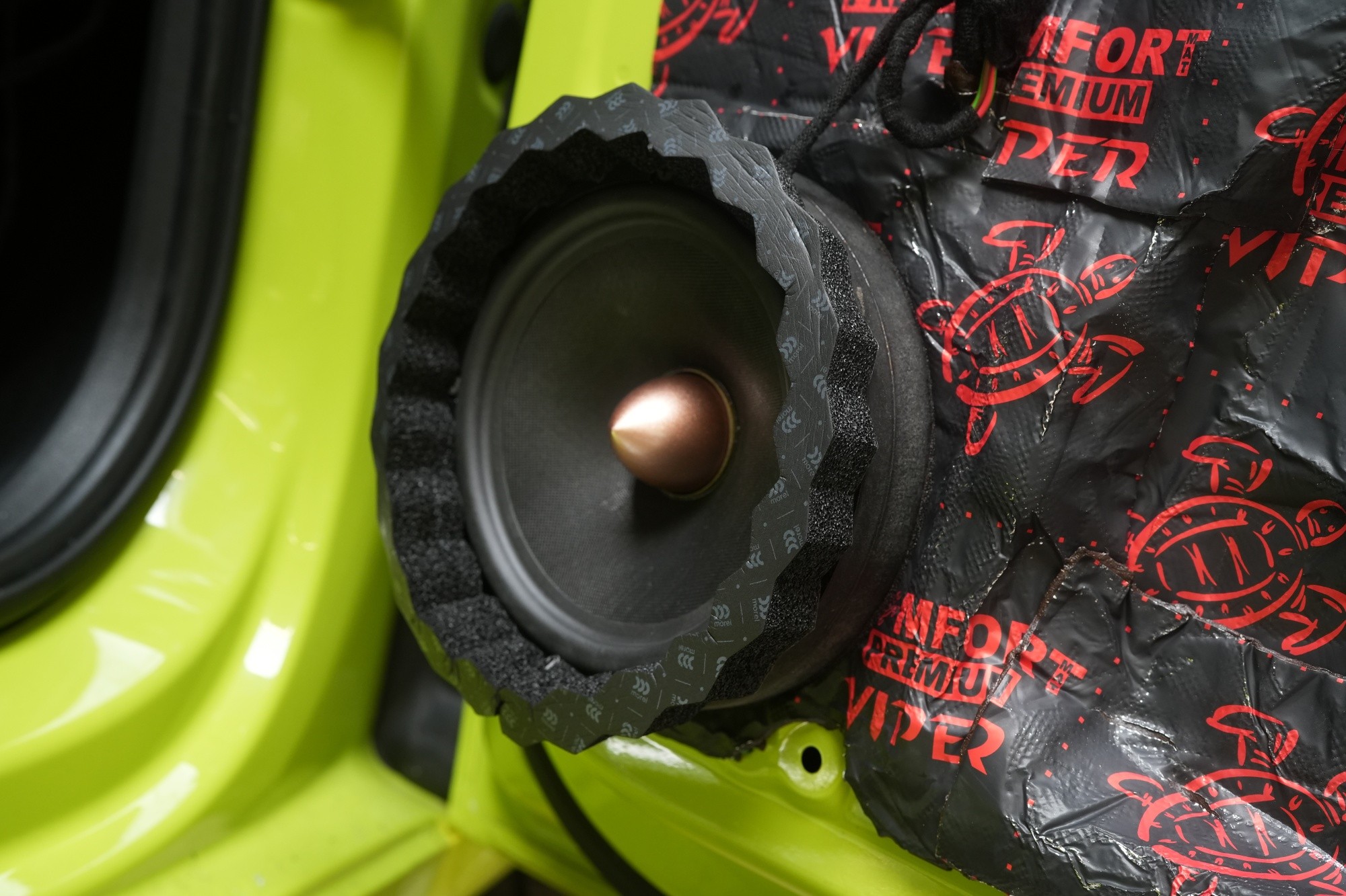 Teraz sa okrem ďalšej vrstvy odhlučnenia v podobe materiálu Comfortmat Viper pozrime aj na krásny stredobasový reproduktor. Ten na prvý pohľad zaujme svojim robustným fázovým vrchlíkom v medenej farbe, ktorý zamedzí fázovému posunu a poklesu stredného rozsahu. Membrána vyrobená zo sendvičového materiálu na báze polymérov tekutých kryštálov vyniká zase svojou ľahkosťou a tuhosťou. Spolu s ďalšími technológiami je výsledkom veľmi kvalitný zvuk a netradičný výkon stredobasu.
