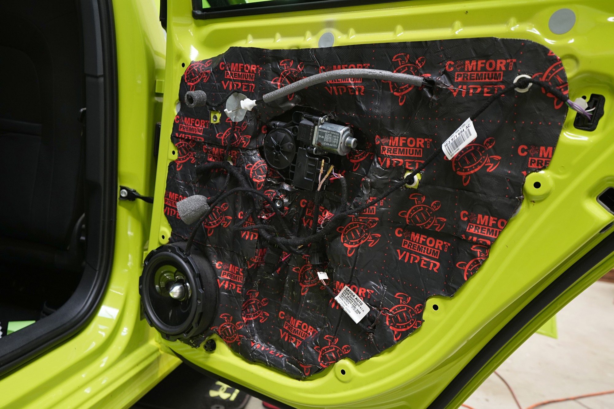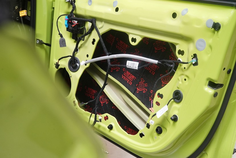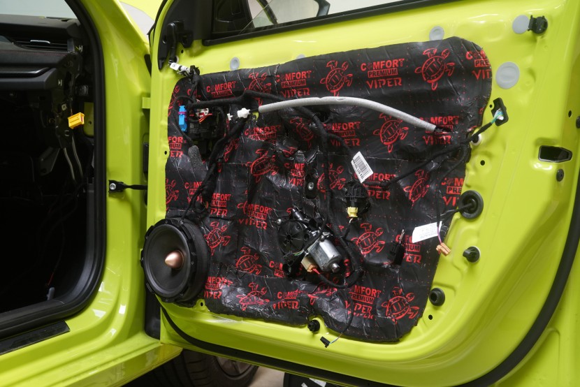 Pokračujeme inštaláciou reproduktorov. Najprv však aplikujeme antivibračný materiál na vonkajší plech dverí, konkrétne Comfortmat Viper s hrúbkou 3 mm. Ten pohltí silné vibrácie od reproduktorov a spevní tenký plech dverí. Viper s akustickým stratovým činiteľom 0,49 jednotiek sa pýši najlepším pomerom účinnosti a nízkej hmotnosti na trhu a je optimálnym riešením na inštaláciu veľmi výkonných reproduktorov. Materiál je samozrejme vodeodolný a má okrem iného antikorózne vlastnosti.