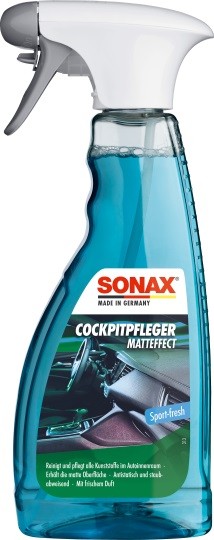 Matný čistič prístrojovej dosky s vôňou "Sport fresh" pôsobí antistaticky, odpudzuje prach a chráni plasty pred opätovným znečistením. Výrobok je špeciálne určený pre matné, štruktúrované plochy a prístrojové dosky vyrobené z dreva. Pôvodný matný vzhľad kokpitu zostáva nezmenený, vyhnete sa ale rušivým odrazom na prednom skle. Výrobok neobsahuje silikón a rozpúšťadlá.