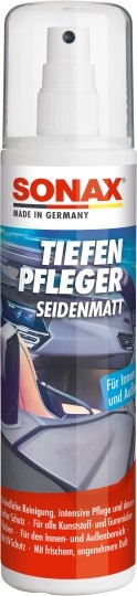 Ošetrenie plastov - matná emulzia - čistí a konzervuje povrch plastových a gumových dielov, oživuje farby. Povrchu dodáva vysoký lesk a chráni pred ďalším znečistením. Vhodné na ošetrenie kokpitu, pneumatík, spojlerov, ozdobných líšt a pod. Pôsobí antistaticky.