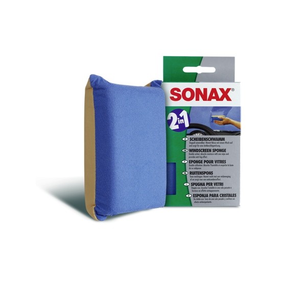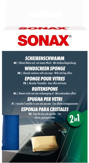 Špongia na čistenie a ošetrenie skla - žltou stranou špongie najskôr odstránite vlhkosť a pre antizahmlievací efekt použite modrú časť špongie.