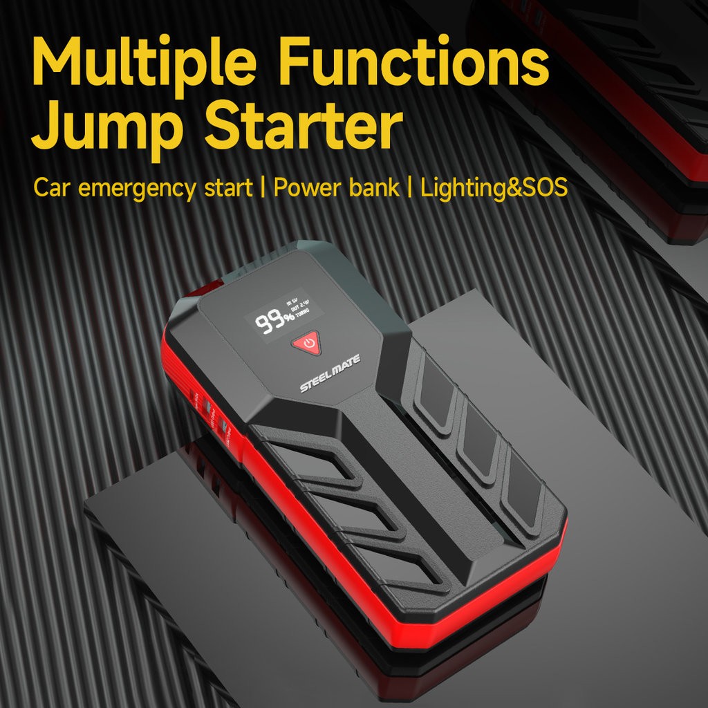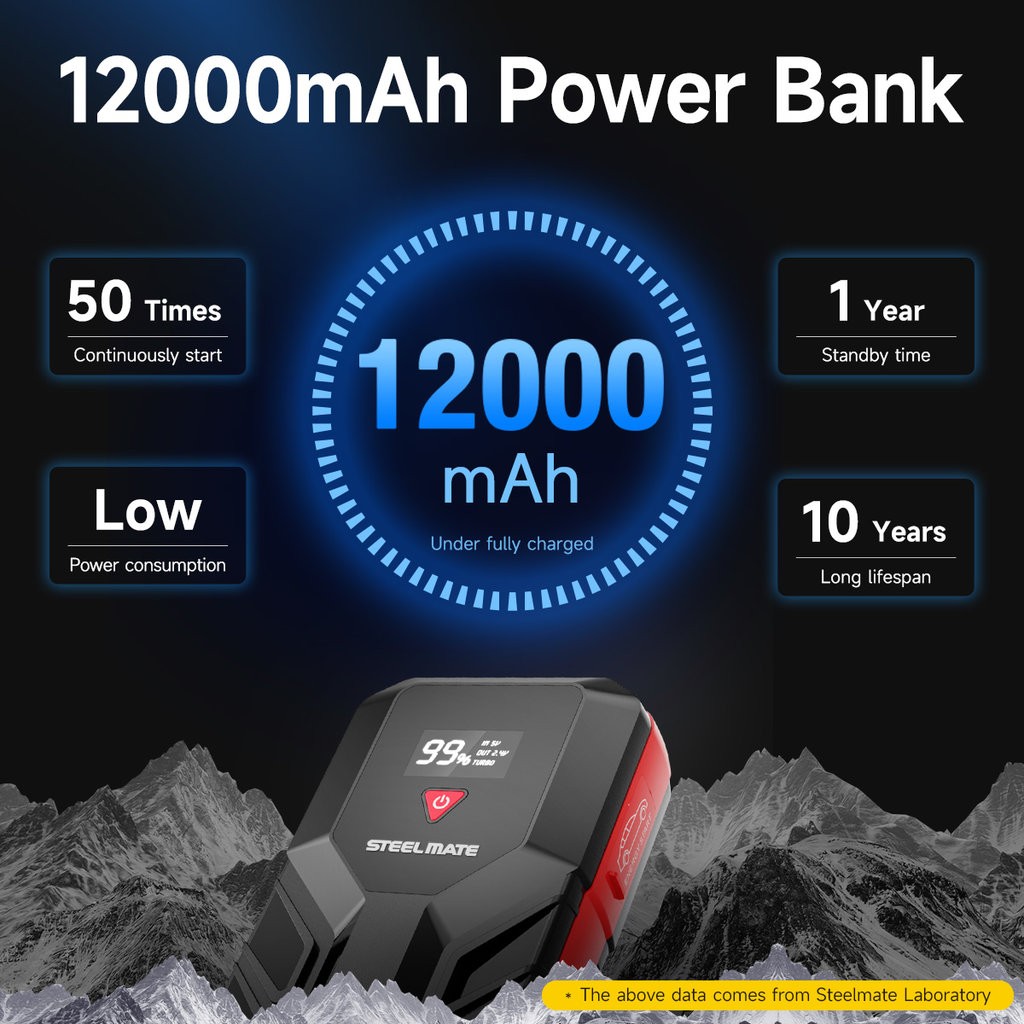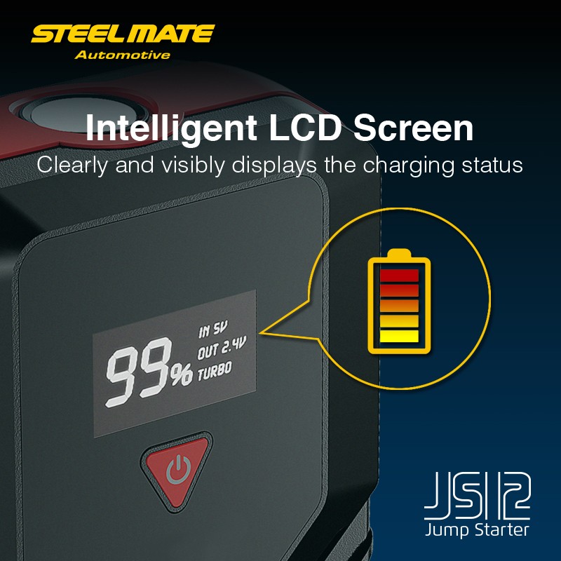 Kompaktná štartovacia súprava s kapacitou 12 000 mAh od spoločnosti Steelmate vám pomôže naštartovať vozidlo a poslúži aj ako powerbanka na nabíjanie cez USB alebo ako prenosné LED svetlo. Jump starter je vybavený prehľadným LCD displejom, ktorý zobrazuje aktuálny prevádzkový stav.