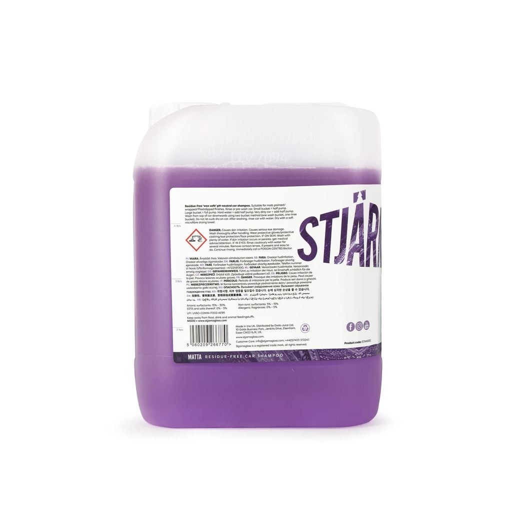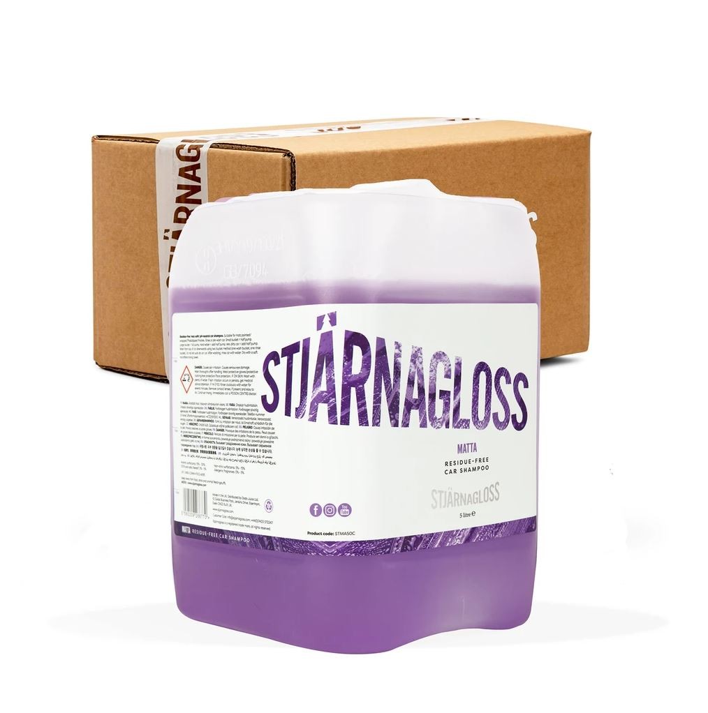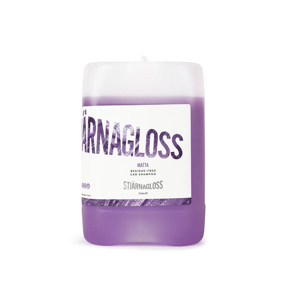 Stjärnagloss Matta je šampón, určený špeciálne pre matné laky, vďaka zloženiu nedôjde k žiadnemu nežiaducemu lesku. Neobsahuje oleje a látky zvyšujúce lesk. Je možné ho bezproblému použiť na čelnom skle aj bežných lakoch. Jeho pH neutrálne zloženie poskytuje vynikajúci čistiaci výkon, vosky ani keramický povlak pritom neodstraňuje. Je to šampón s vysokou penivosťou, ktorý je navrhnutý tak, aby poskytoval najvyššiu úroveň mazivosti, jemne brzdí povrchové napätie a zdvíha častice nečistôt od povrchu.