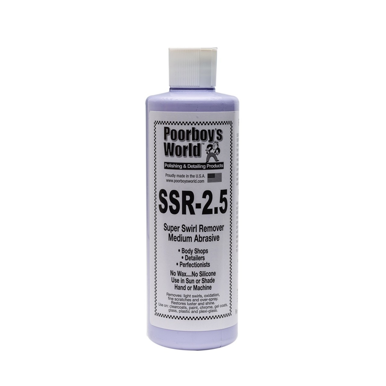 Stredne silná leštiaca pasta od Poorboy's. Dokáže odstrániť stredne ťažké až ťažké kruhové škrabance, oxidáciu a hravo odstrániť vlasové škrabance. Je možné použiť na lak, chróm, sklo, plast alebo aj plexisklo. Dokáže veľmi dobrý "finiš". SSR 2.5 obnovuje lesk. Po dokončení práce s touto brúsnou pastou odporúčame použiť niektorý z polishov od Poorboy's. Môžete používať ako na slnku, tak v tieni. Rozhodne však odporúčame aplikovať pri strojovom leštení.
