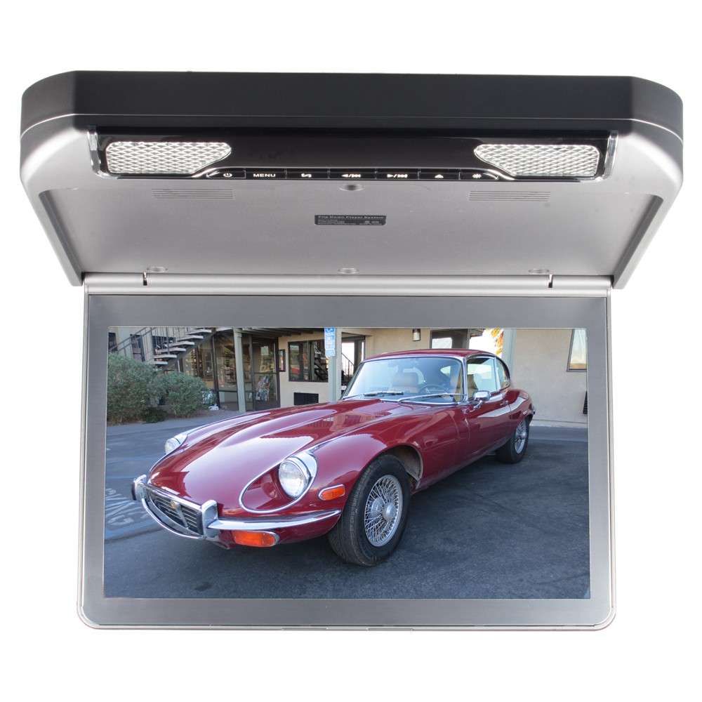 Elegantný stropný výklopný monitor 13,3" šedý, s DVD prehrávačom, čítačkou SD kariet, USB portom a so zobrazením 16: 9. Diaľkové ovládanie s vstavanou hernou konzolou + disk s uloženými hrami.Technické parametre monitora