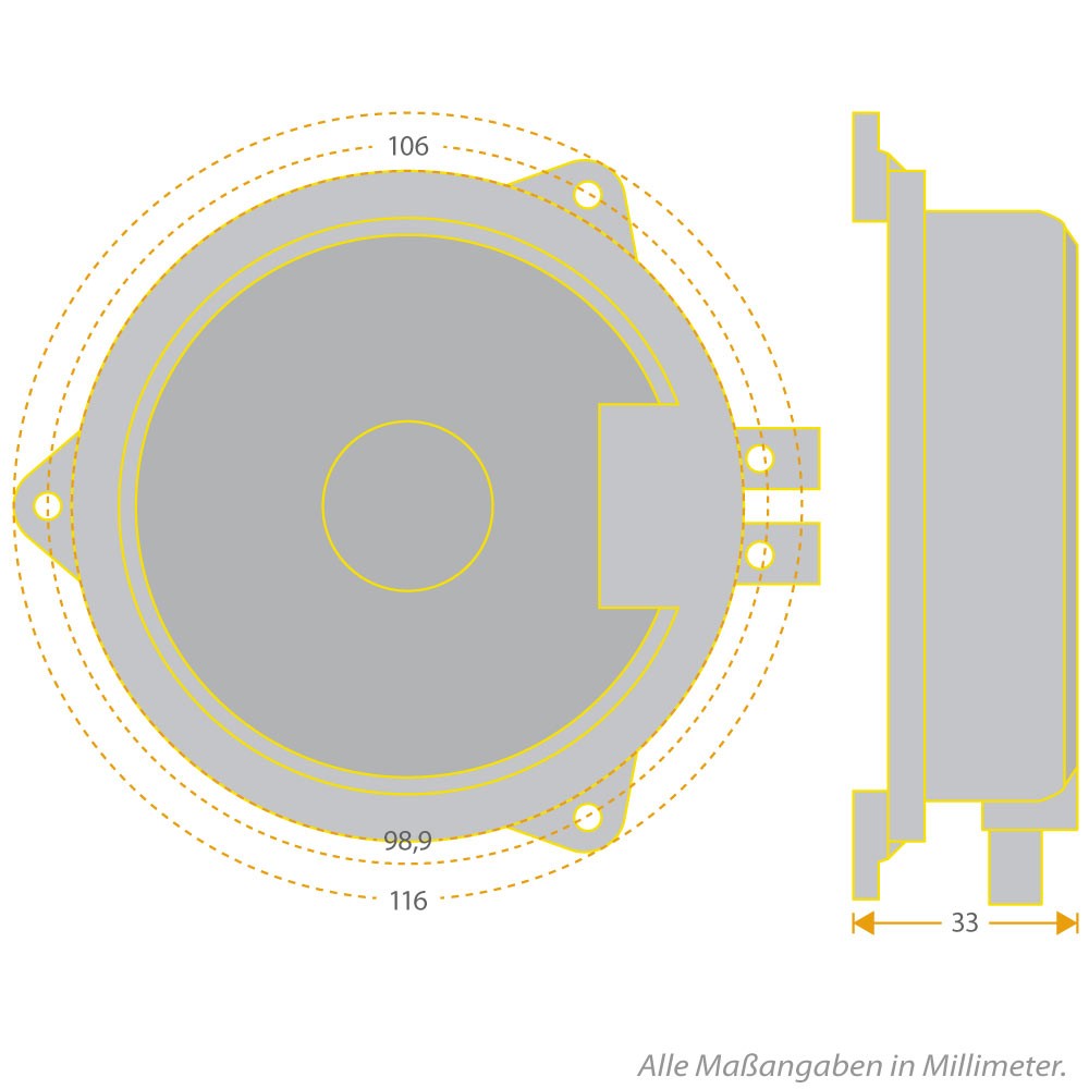 | Rozmery boxuRozmery ozvučnice sú uvádzané ako výška, šírka a hĺbka, ktorá je často na spodnej hrane dlhšia ako na hornej hrane, z dôvodu skosenie zadnej steny. | 116 x 33 mm |