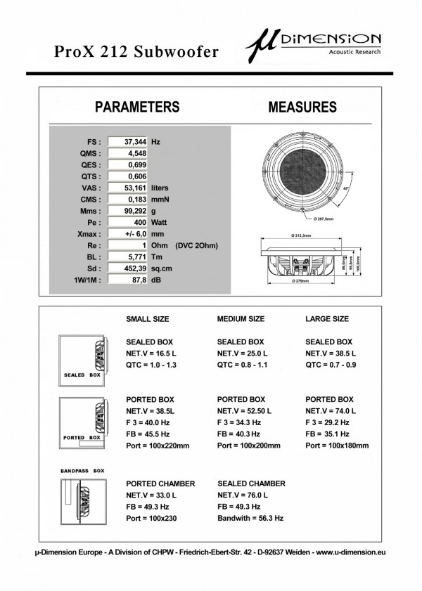 400 W RMS, 87,8 dB (1W / 1m), 2 x 2 Ω, 12 "