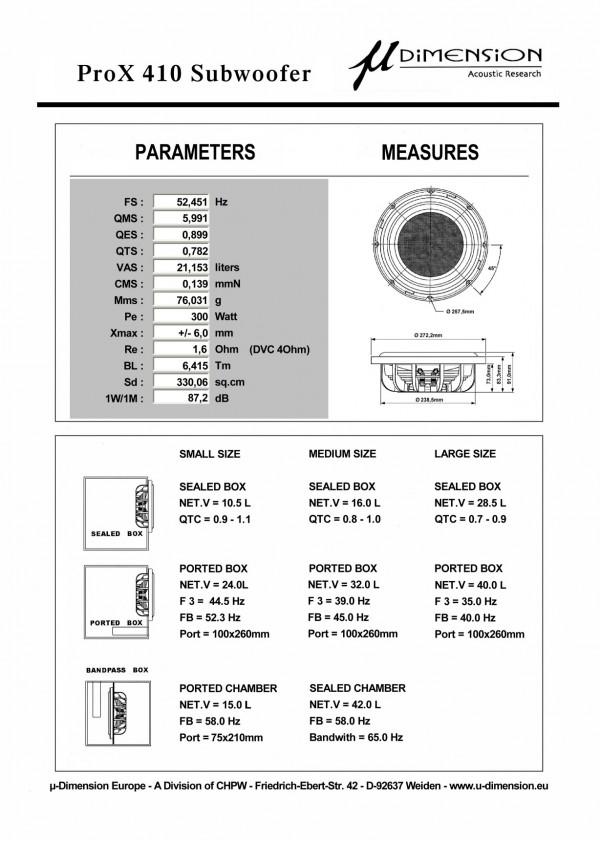 300 W RMS, 87,2 dB (1W / 1m), 2 x 4 Ω, 10 "