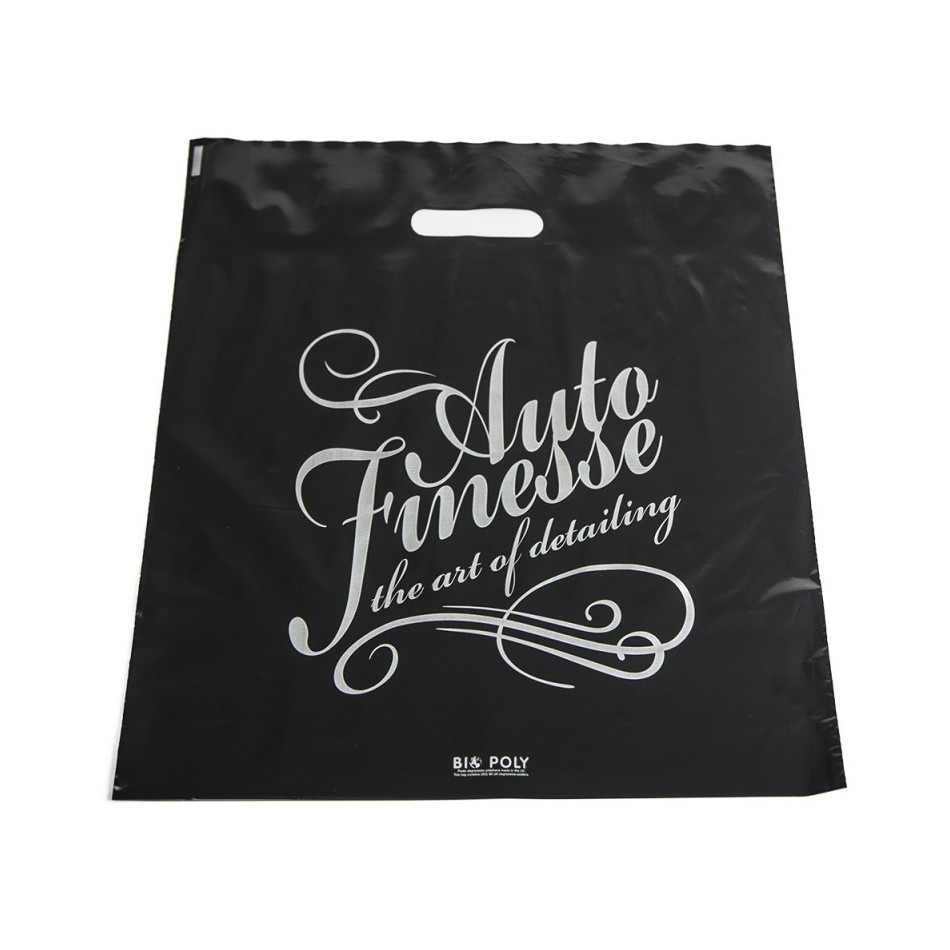 Čierna igelitová taška s logom Auto Finesse. Veľkosť: 180 x 380 mm. Taška je vhodná na prepravu ľahších predmetov, alebo ju môžete použiť napríklad aj na uskladnenie mikrovláknových utierok alebo uterákov.
