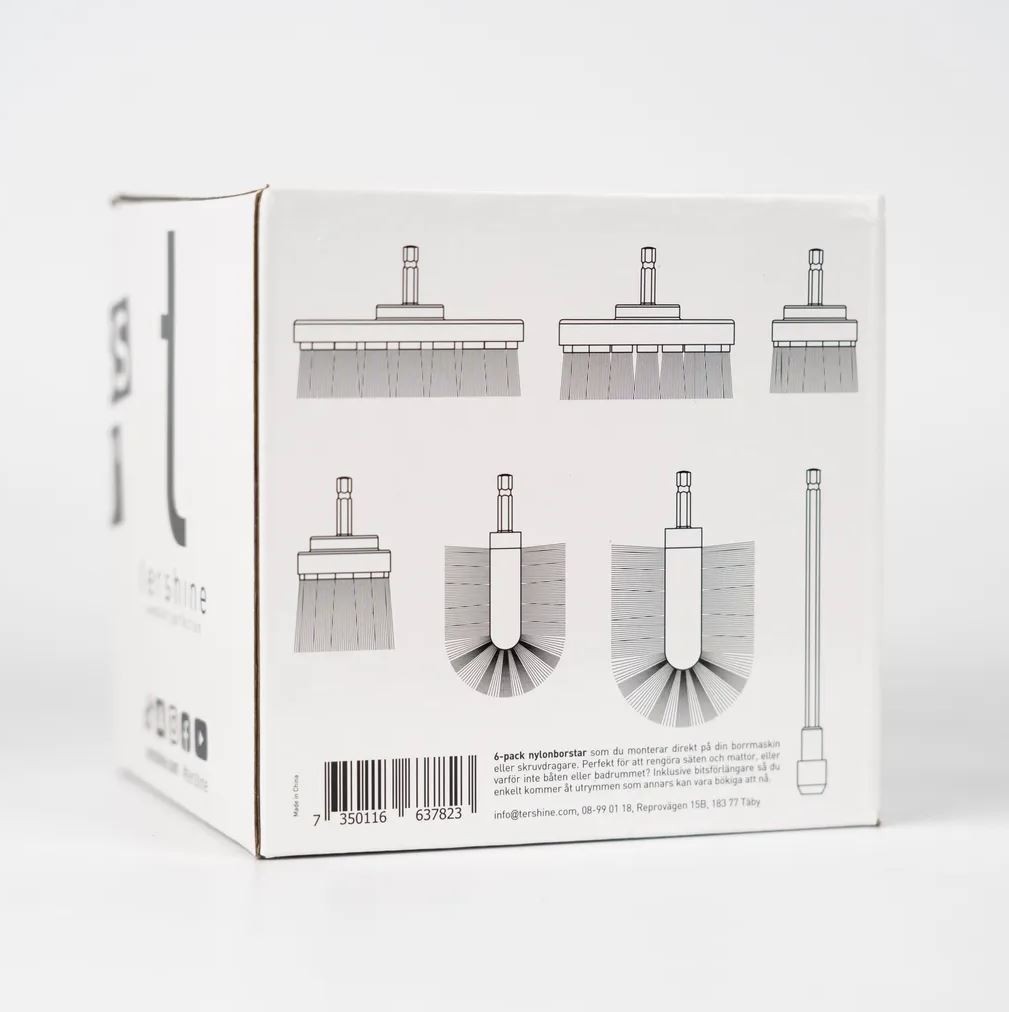 Balenie 6 nylonových kief, ktoré je možné namontovať priamo na vŕtačku alebo aku skrutkovač. Perfektný nástroj na čistenie sedadiel alebo kobercov. Sada je vrátane 15cm nadstavca (bit), ktorý vám umožní prístup do miest, ktoré by inak mohli byť ťažko dostupné. Skvelé kombo spolu s Tershine APC na interiér auta, ale aj v domácnosti alebo spolu s Tershine Extract na "zažraté" a odolné nečistoty napr. na balkóne/fasáde/lodi atď.