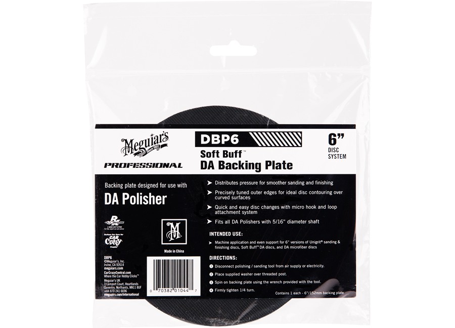 Nový systém unášačov Meguiar's výrazne zjednodušuje a zefektívňuje strojové leštenie. Zároveň vám uľahčí výber správneho unášača pre konkrétny kotúč. Unášač DBP6 je určený na použitie s MT310 Meguiar's DA leštičkou a ďalšími orbitálnymi leštičkami s priemerom závitu 5/16". Slúži na uchytenie nových penových kotúčov Meguiar's Soft Buff s priemerom 5" (DFC6, DFP6 a DFF6) a mikrovláknových kotúčov DA Microfiber s priemerom 6" (DMC6 a DMF6).