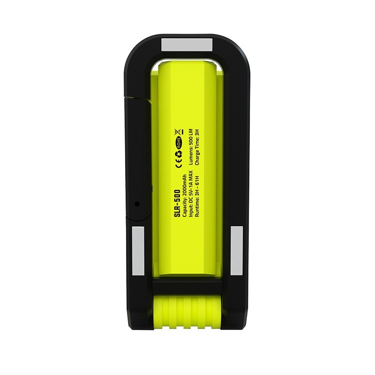 SLR-500 môžete používať aj bez držania, má otočnú rukoväť o 180°, ktorú je možné umiestniť v uhle až 45° ako plochý stojan. Používa sa na pripevnenie na magnetické povrchy, alebo sa vytiahne až na doraz a použije sa ako závesný hák s kĺbovým upevnením, napríklad pre umiestnenie na potrubie. Svietidlo je vyrobené zo super húževnatej konštrukcie so žiarivo žltým polykarbonátovým chrbtom pre zvýšenie odolnosti, trvanlivosti a viditeľnosti.