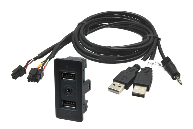 - Adaptér na pripojenie 2x USB a AUX signálu nahradzuje pôvodný konektor v automobile pri použití aftermarket (dodatočne) inštalovaného autorádia.