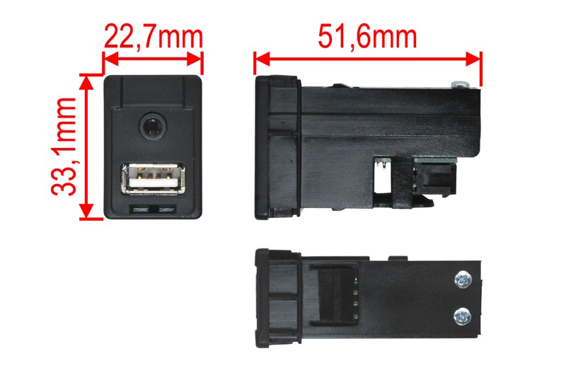 - Adaptér na pripojenie USB a AUX signálu, nahrádza pôvodný konektor v automobile pri použití aftermarket (dodatočne) inštalovaného autorádia s výstupom USB + CINCH konektor.