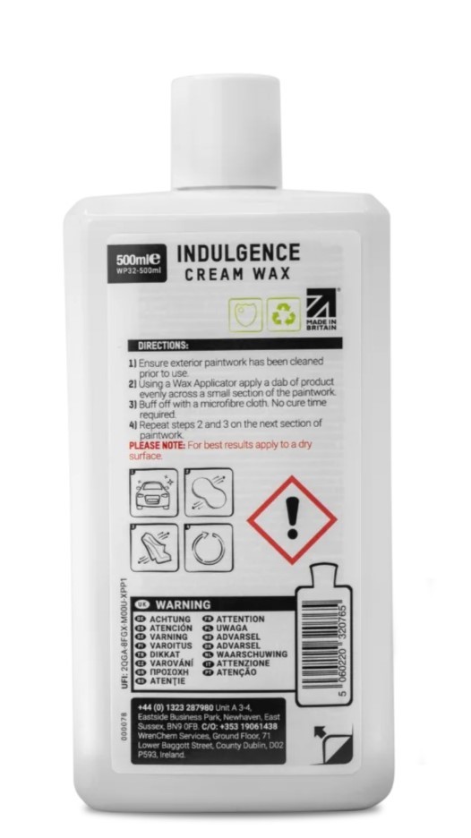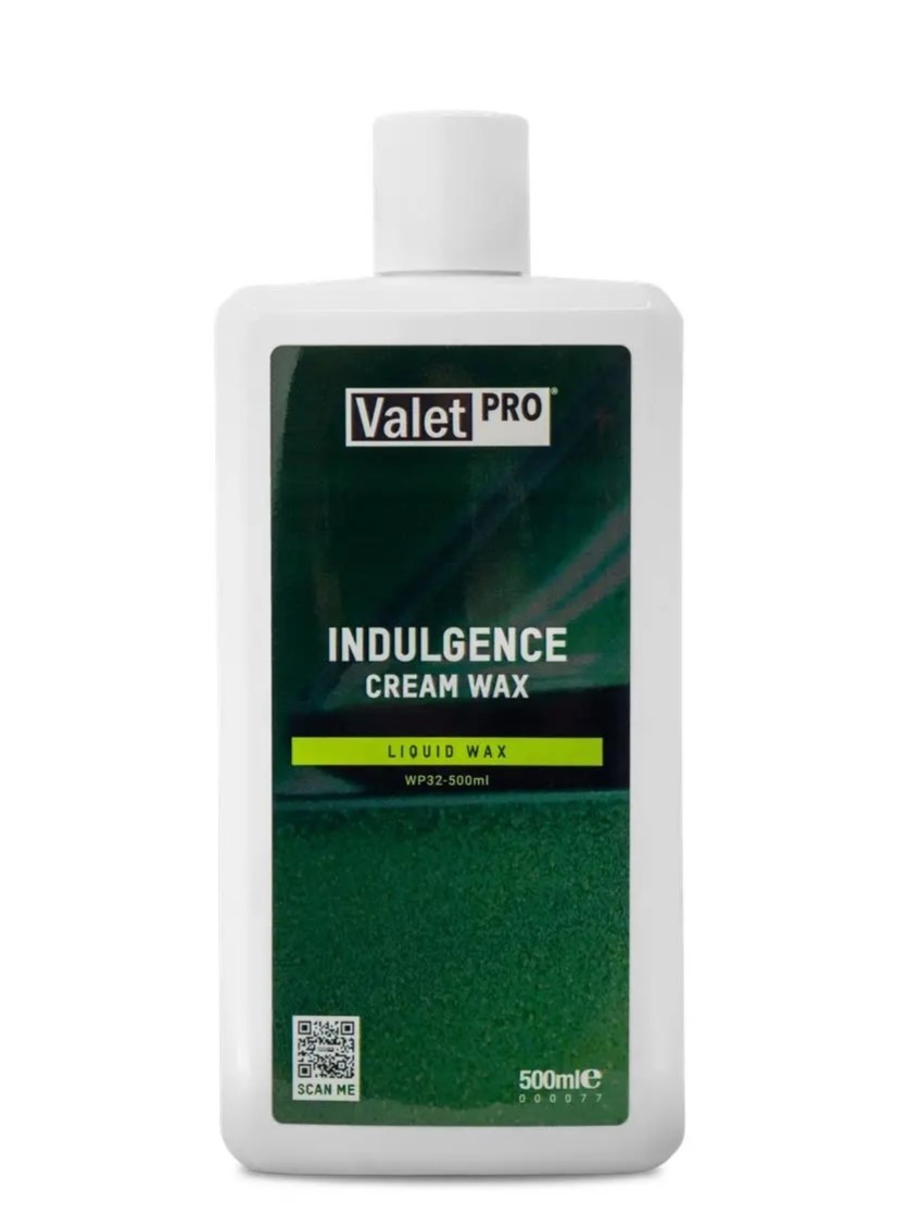 Indulgence Cream Wax je tekutý vosk navrhnutý tak, aby uľahčoval krok ochrany každého automobilu. Jeho hladkú a krémovú štruktúru je možné na lak nanášať jednoduchým nanášaním a zotretím, čo šetrí čas v porovnaní s tradičnými tvrdými voskami. Použitím veľmi kvalitného prírodného karnaubského vosku zanecháva tento produkt vysoko lesklý povrch. Krémový vosk tiež poskytuje pôsobivý beading a UV ochranu.