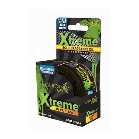 California Scents gélový osviežovač vzduchu Xtreme s vôňou Artic Ice, slovensky - "Ľadovo svieža". Gélové osviežovače Xtreme prinášajú v malom praktickom balení maximálnu intenzitu vône. Každá nádobka obsahuje 90% silne koncentrovaného vonného oleja v tuhej podobe. Ten sa vďaka špeciálnej technológii rovnomerne odparuje a prevonia priestor podmanivou vôňou. Gél sa navyše nepremieňa na tekutinu, takže vo vozidle nehrozí ani pri prevrhnutí poliatie, či dokonca poleptanie interiérových častí vozidla. Túto vôňu si môžete vychutnávať až po dobu 45 dní.Prírodné a zároveň ekologické vône do auta