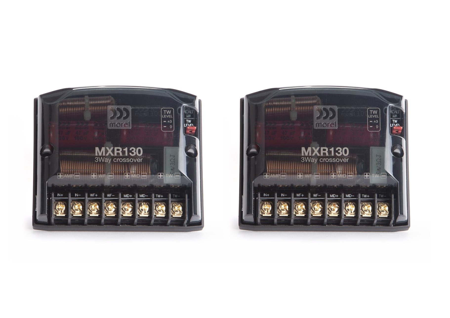 3-pásmové výhybky Morel MXR130 z modelovej rady Virtus a Maximo Ultra sú navrhnuté pre úplnú integráciu komponentov so starostlivo vyladenými akustickými parametrami pre výškové, stredové a basové reproduktory. Výhybky Morel MXR130 kombinujú niekoľko nových konceptov a funkcií, ktoré zlepšujú zvukovú prezentáciu a kvalitu zvuku systémov Morel.- 450Hz/4500Hz LP/BP/HP