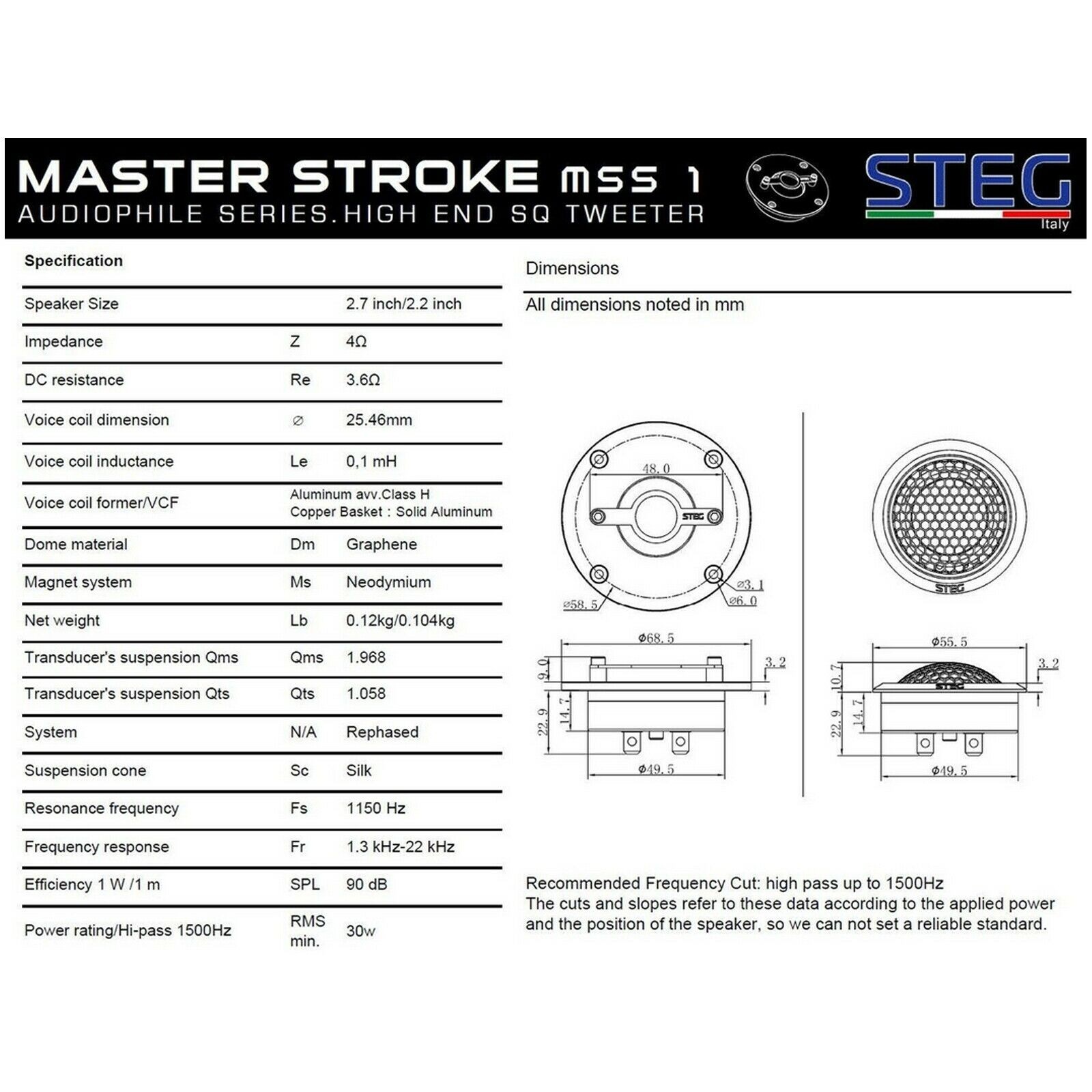 Najmodernejší systém navrhnutý a vyrobený bez kompromisov. Kôš výškových reproduktorov MSS je vyfrézovaný z pevného bloku hliníka, čo umožňuje zažiť zvuk bez rezonancie. "V ničom nezhrešiť!" - povedali si v Taliansku a reproduktory testovali na najlepších simulátoroch pri extrémne vysokej záťaži. Dokážu uchvátiť poslucháčov kvalitou zvuku, presnosťou a impulzívnou odozvou, a to vďaka ich extrémne nízkej rezonančnej frekvencii.