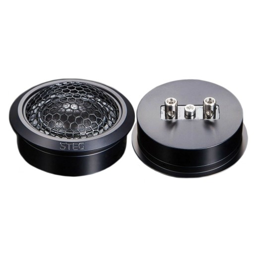 | Typy reproduktorov Koaxiálne reproduktory: Koaxiálne reproduktory sa vyznačujú konštrukciou tzv. Všetko v jednom. Výškový a stredobasový reproduktor sú v jednom koši. Výhodou je jednoduchšia montáž, ale vďaka spojeniu resp. blízkosti pásiem v jednom reproduktore, sa zvyčajne zníži kvalita zvuku. Spravidla uprostred stredobasového reproduktora, je výškový reproduktor, ktorého kmitacia cievka pracuje v druhej vzduchovej medzere spoločného magnatického obvodu. Trojpásmový koaxiálny reproduktor sa skladá zo stredobasového reproduktora, v predu na osobitnom nosníka je stredový reproduktor a samostatný výškový. Komponentné reproduktory: Komponentné reproduktory sa vyznačujú rozdelením na jednotlivé frekvenčné pásma, výškové + stredobasové + popr. basové pásmo. Jednotlivé reproduktory sa dajú umiestniť úplne oddelene, čo má za výsledok lepší zvukový aj akustický prejav. V drvivej väčšine prípadov komponentných reproduktorov je dodávaná aj externá výhybka, ktorá rozdeľuje výškové, stredové / stredobasové a u třípásma aj basové pásmo popr. umožňuje nastavenie decibelovej úrovne u výškového reproduktoru (napr. +2 dB, 0 dB, -2 dB), strmosti (napr. 6dB / okt. 12dB / okt.) či aktívne alebo bi-amp zapojenia. | Výškové |