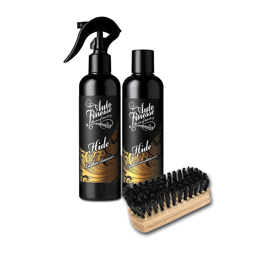 Vysoko kvalitná základná sada na čistenie a ochranu kože v automobile obsahuje efektívny, ale šetrný čistič kože (250 ml) a kondicionér na kožu s matným efektom (250 ml) od Auto Finesse. Sada je doplnená o kvalitnú, jemnú kefu na kožu od Poka Premium. Auto Finesse Hide Leather Cleanser je hodnotený ako jeden z najlepších čističov kože na trhu. Je založený na báze glycerínu a je špeciálne vyvážený tak, aby bezpečne odstránil znečistenie zo všetkých typov kožených povrchov. Hide Leather Cleanser rýchlo preniká do pórov materiálu, pôsobí na hlboko "zakorenené" nečistoty, škvrny a mastnotu. Dokonca odstráni aj škvrny spôsobené modrými džínsami alebo šmuhy od topánok. Je úplne bezpečný pre akékoľvek kožené povrchy.