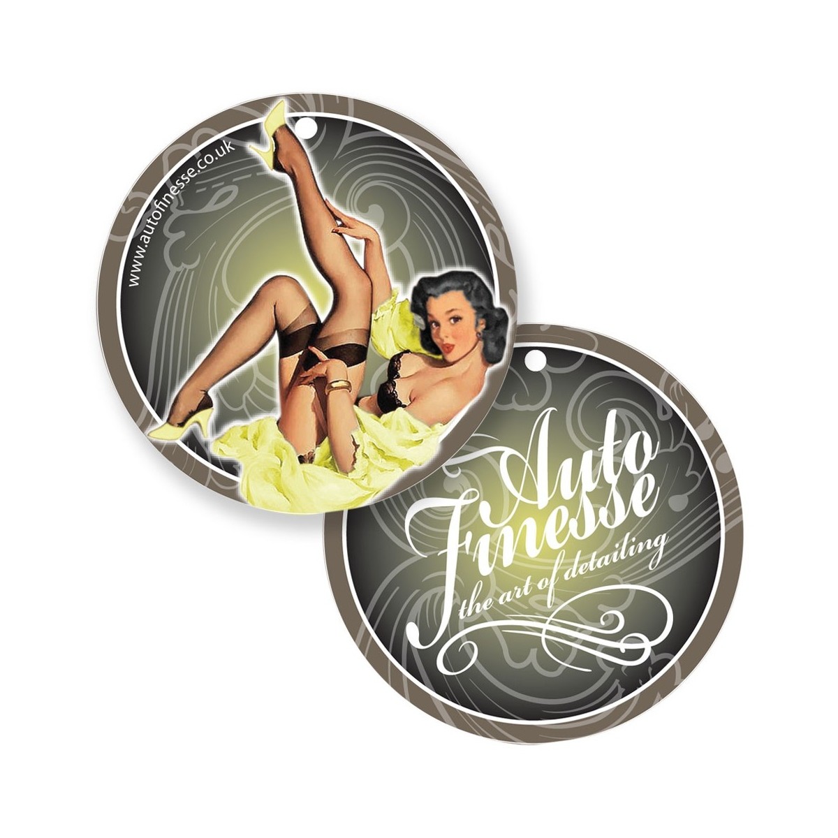 Originálny Auto Finesse osviežovač vzduchu na zavesenie v interiéri. Lahodná vôňa parfému dokáže okamžite navodiť príjemnú atmosféru. Závesná vôňa Auto Finesse nielen skvele vonia, ale aj dobre vyzerá. Na jednej strane s logom značky, na druhej retro portrét zvodnej ženy.
