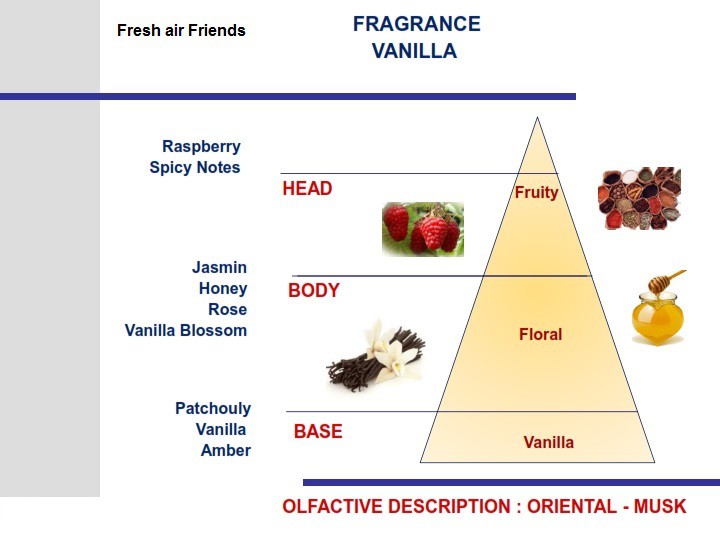 Cesare je osviežovač vzduchu pre automobily, ktorý obsahuje agresívne molekuly, ktoré dokážu dlho bojovať proti zákerným baktériám, ktoré spôsobujú zápach. Harmonická vôňa kytice zlúčená z kontrastných vôní – mandlí, jazmínu, zmyselného santalového dreva, vanilky a pižma, taká je vôňa Vanilla (Vanilka). Panáčik Cesare z kolekcie obľúbených panáčikov Fresh Air Friends od Mr & Mrs Fragrance je ideálny parťák na prevonanie interiéru vášho auta.Panáčik do ventilácie Mr&Mrs Fragrance z rady CESARE
