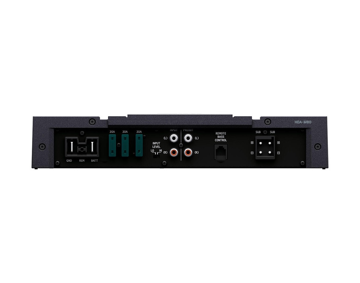 - Jednostranný terminál - všetky prípojky (napájanie, reproduktorové výstupy, RCA vstupy/výstupy a konektor diaľkového ovládača basov), rovnako ako všetky poistky sú umiestnené na spodnej strane zosilňovača. Vďaka tomu je oveľa jednoduchšie dosiahnuť čistú inštaláciu vo vašom vozidle.