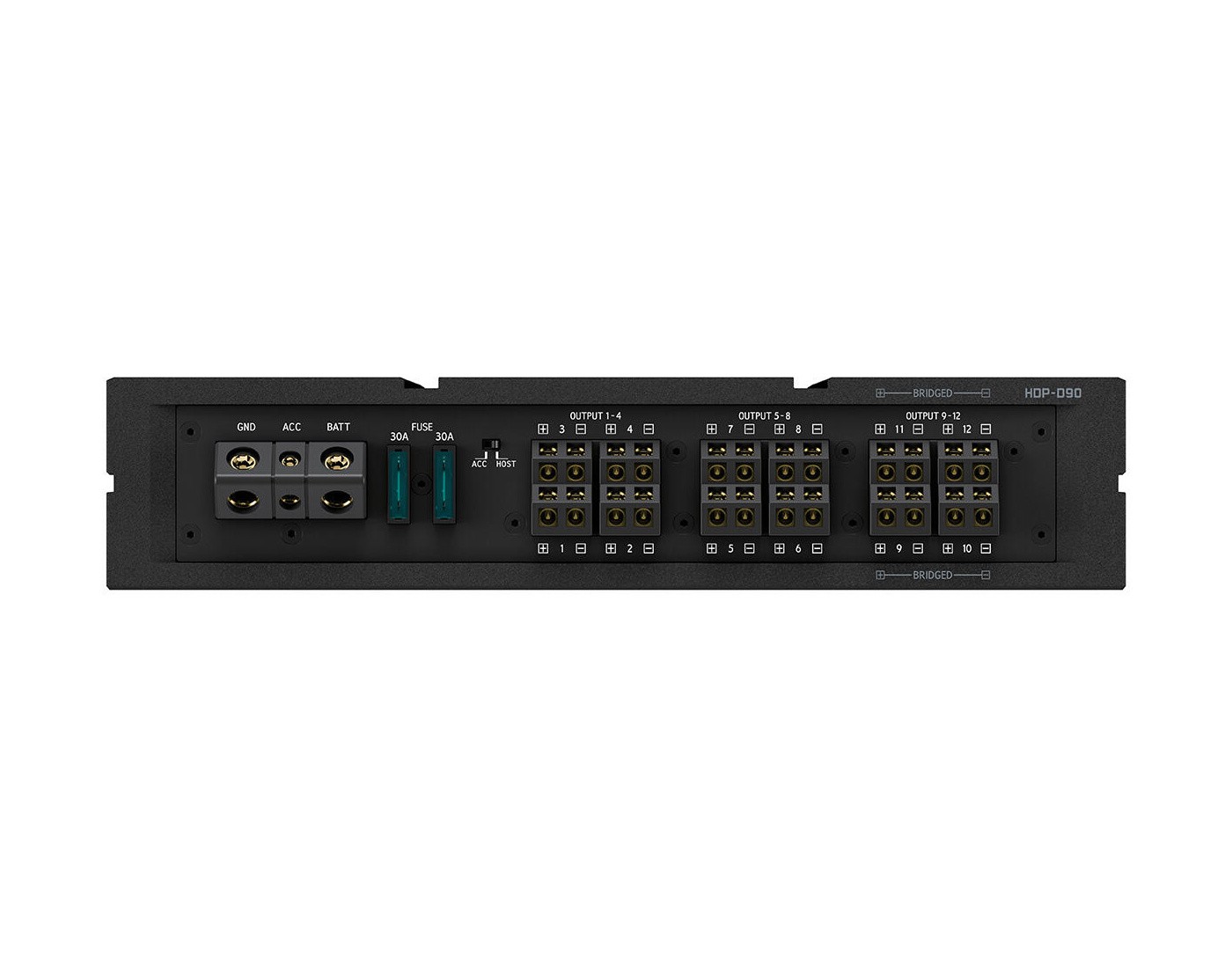 - 12 kanálové vysoko výkonné vstupy - najzaujímavejšie vlastností HDP-90 sú 12kanálové vstupy na úrovni reproduktorov s maticovým sčítaním vstupov. To umožňuje pripojenie HDP-D90 k väčšine existujúcich originálnych zvukových systémov (dokonca aj k veľkým viackanálovým OEM systémom), čím sa v audio reťazci nahradia všetky komponenty za hlavnou jednotkou. To vám umožní vytvoriť si požadovaný zvukový systém a zároveň zachovať pôvodný rádio/navigačný systém vášho vozidla. Je tiež vybavený 2-kanálovými RCA vstupmi, optickými TOSLINK a koaxiálnymi vstupmi a tiež Bluetooth Audio (s dodaným Bluetooth donglem).