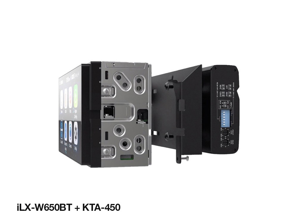 - Napojenie s iLX-W650BT - jednotka iLX-W650BT a zosilňovač KTA-450 sú namontované dohromady a spoločne majú hĺbku menšiu ako 12,7 cm, takže sa zmestia do akéhokoľvek štandardného 2DIN rádiového doku, spoločne tvoria ocenený dizajn Power-Stack Alpine. Konzoly a priložené káblové zväzky umožňujú rýchlu a jednoduchú inštaláciu. Vychutnajte si vylepšený zvukový systém bez použitia tradičného zosilňovača.