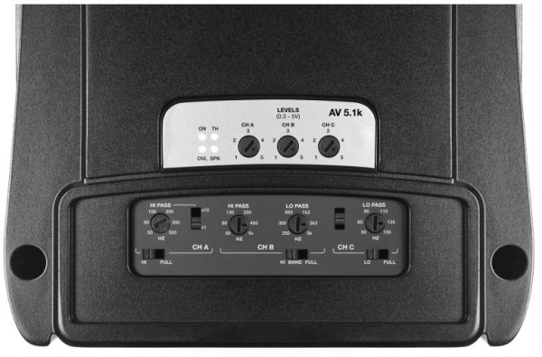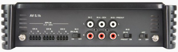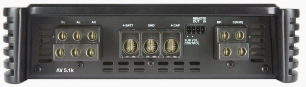Päťkanálový zosilňovač AV 5.1k s maximálne 1650 W (RMS) v súčte. Vďaka svojej hybridnej konštrukcii je to špeciálny zosilňovač pre predné + zadné + subwoofer alebo multi-zosilnené predné + subwooferové systémy. Jeho vysoko kvalitný výstup triedy AB poskytuje dva kanály s výkonom 250 W (RMS) v kombinácii s ďalším párom čistých zvukových kanálov triedy A s výkonom 75 W (RMS), čo je ideálne pre aktívne systémy dvojpásmových predných reproduktorov. Sekcia D mono poskytuje výkon 1000 W (RMS) pre efektívny a výkonný výstup subwoofera. AMP (Amplifier Management Processor) neustále kontroluje operačný systém a komunikuje s užívateľom pomocou 4 rôzne farebných LED diód, umiestnených na hornom paneli; ART (Automatic Remote Turn On-Off) umožňuje automatické zapnutie / vypnutie, ak nie je signál zo zdroja k dispozícii. AV 5.1k tiež umožňuje nahradiť analógovú vstupnú platňu digitálnou doskou (AV bit IN).