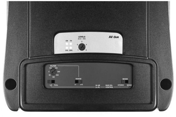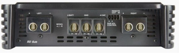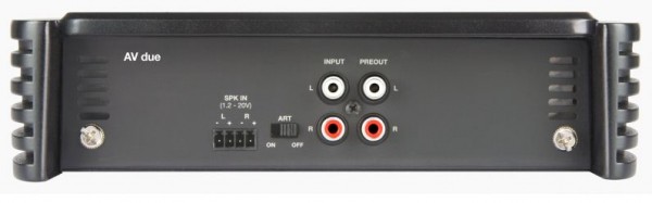 AV due je výkonný stereo zosilňovač, ktorý zaisťuje veľmi vysoký výstupný prúd s výkonmi až 900 W (RMS). AMP (Amplifier Management Processor) neustále kontroluje operačný systém a komunikuje s užívateľom pomocou 4 rôznych farebných LED diód, umiestnených na hornom paneli. ART (Automatic Remote Turn On-Off) umožňuje automatické zapnutie / vypnutie, ak nie je signál zo zdroja k dispozícii. Ak používate subwoofer v mono zapojení, môžete použiť diaľkový ovládač hlasitosti VCRA pripojením k špeciálnej zásuvke SUB VOL. Pre každý typ inštalácie existujú nekonečné možnosti nastavenia. Funkcia AV due tiež umožňuje nahradiť dosku analógového vstupu digitálnou doskou (AV bit IN).