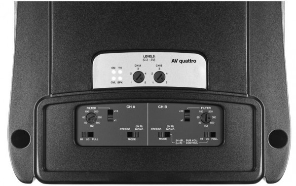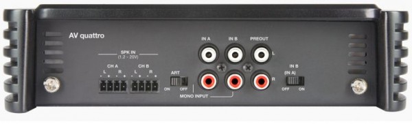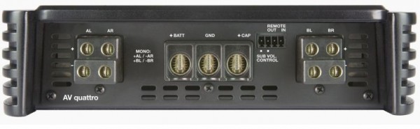 AV quattro je štvorkanálový zosilňovač, ktorý môže pracovať v štvor, troj a dvojkanálovom režime a poskytuje celkový výkon 1700 W (RMS). Je navrhnutý tak, aby zvládal zložité konfigurácie ako predné / zadné a viackanálové systémy. AMP (Amplifier Management Processor) neustále kontroluje operačný systém a komunikuje s užívateľom pomocou 4 rôznych farebných LED diód, umiestnených na hornom paneli. ART (Automatic Remote Turn On-Off) umožňuje automatické zapnutie / vypnutie, ak nie je signál zo zdroja k dispozícii. Vstupy a ARTTM zaisťujú prepojenie s každým typom zdroja. AV quattro tiež umožňuje nahradiť analógovú vstupnú platňu digitálnou doskou (AV bit IN).