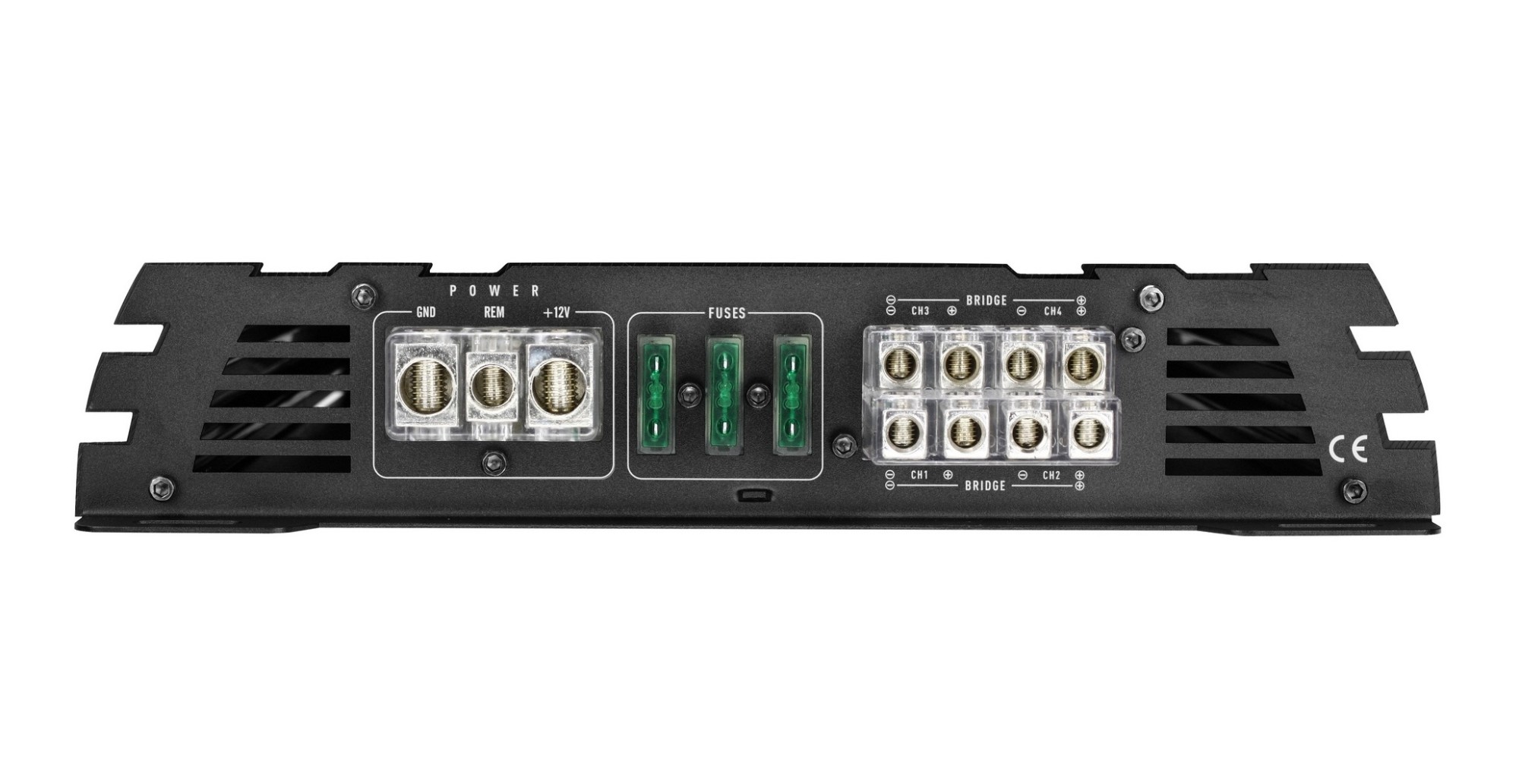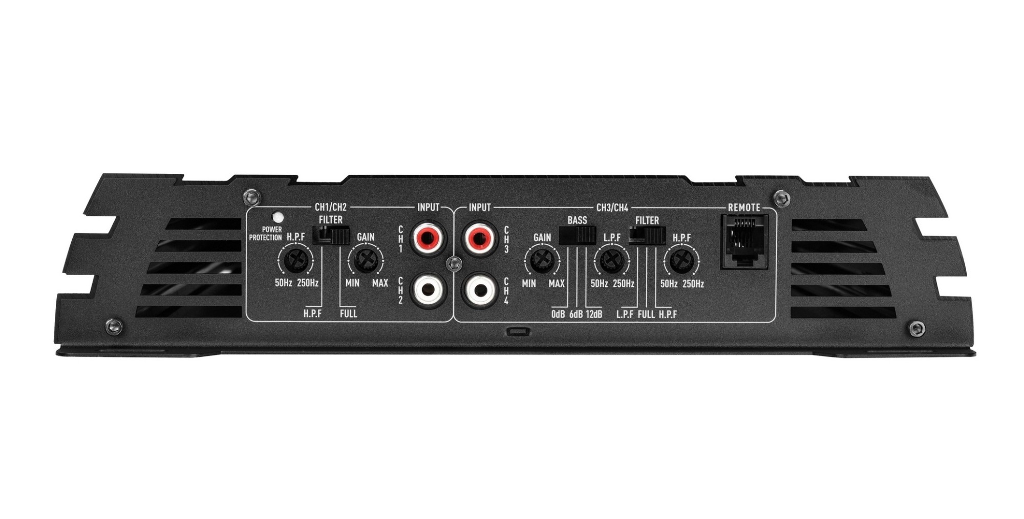 4kanálový zosilňovač, 4 x 110/2 x 400 W RMS (4 Ω), 4 x 200 W RMS (2 Ω), trieda AB