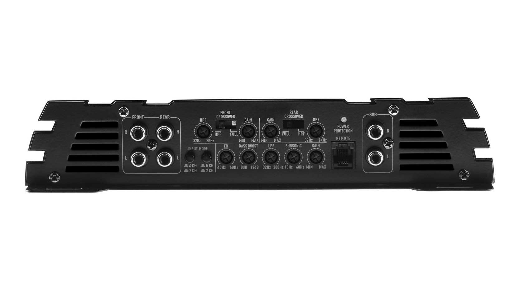 4kanálový zosilňovač, 4 x 75 + 1 x 200/350 W RMS (4/2 Ω), trieda AB + D