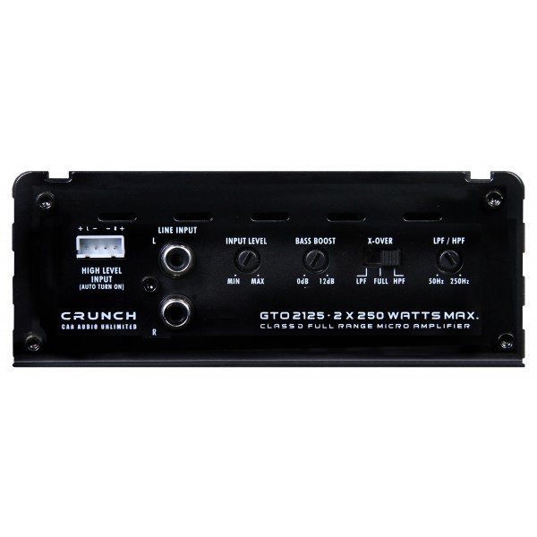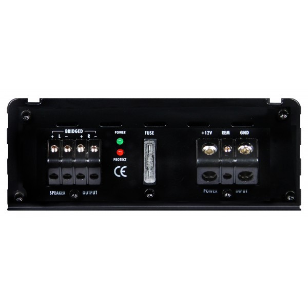 2-kanálový, 2 x 75/1 x 250 Watt RMS na 4 Ω, trieda AB, vysokoúrovňový vstup