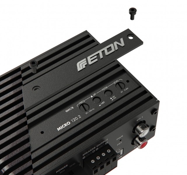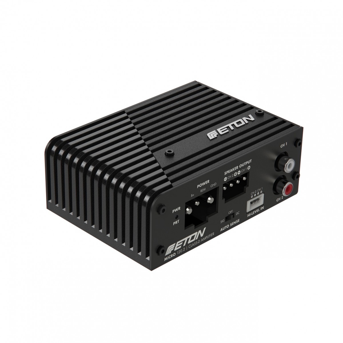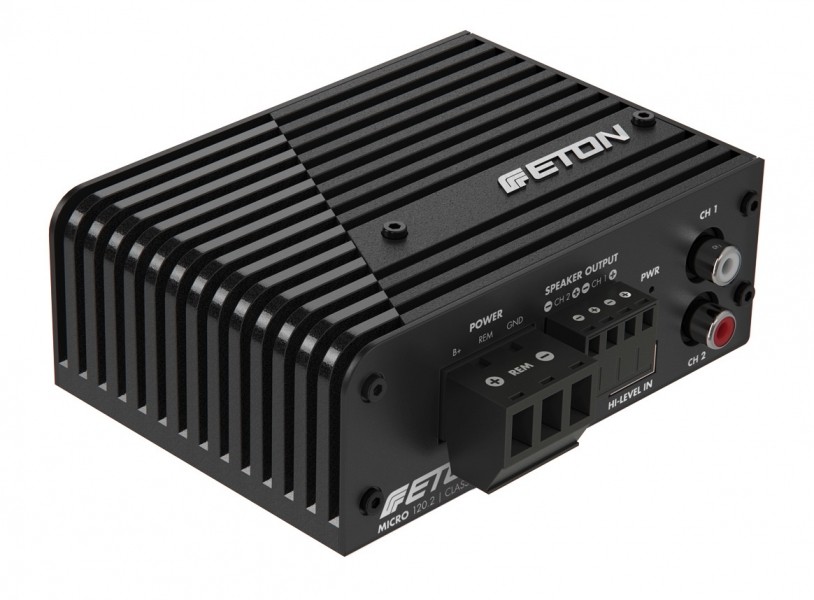 Novinka roka 2019 - Eton Micro 120.2. Zosilňovač miniatúrnych rozmerov, kde Eton reaguje na vzrastajúci dopyt po kvalitných zosilňovačoch veľmi malých rozmerov, ktoré sa dajú inštalovať napr. za autorádio alebo do palubnej dosky. Rozmery micro, ale výkon "mega" - 100 W RMS na 4 Ω na kanál je naozaj úctyhodný výkon. Zosilňovač spoľahlivo pracuje v energetickej triede D.