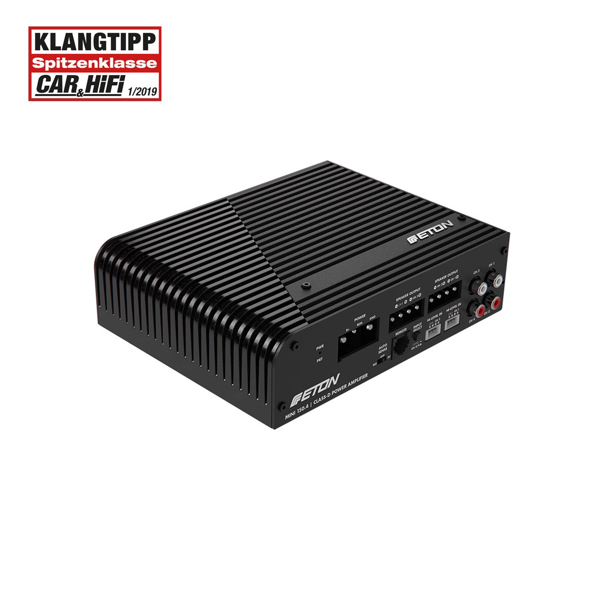 4kanálový zosilňovač malých rozmerov, ale s vysokým výkonom 4 x 100 W RMS na 4 Ω. Zaujímavosťou je modulárny systém uchytenia a vrchná krycia lišta, pod ktorou je dômyselne schované nastavenie zosilňovača. Zosilňovače Eton Mini pracujú v energetickej triede D.